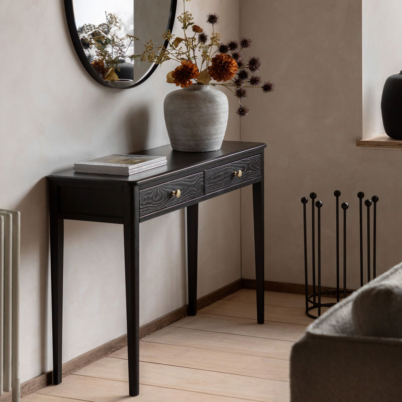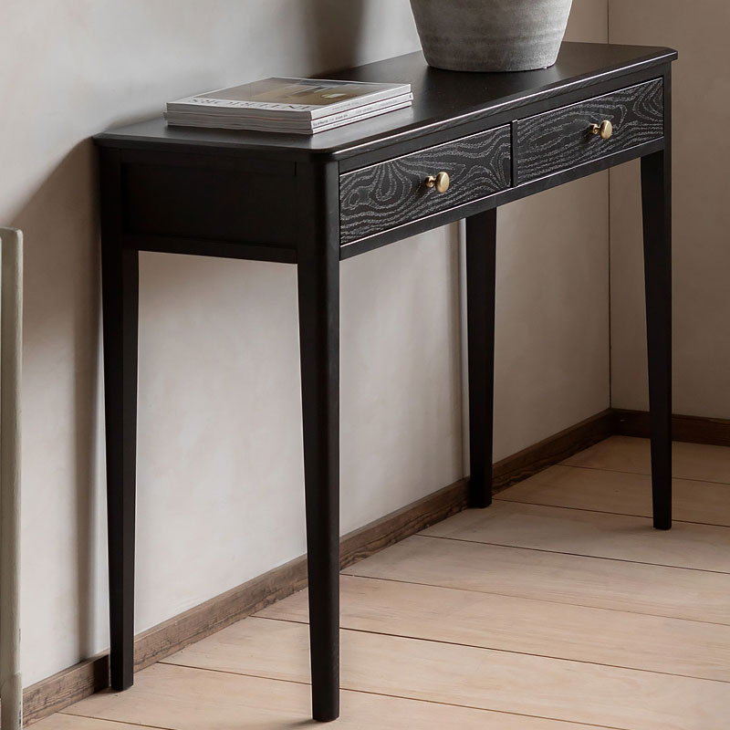 Why we love this 2 Drawer Black Wood Slim Console Table With Gold Metal Handles