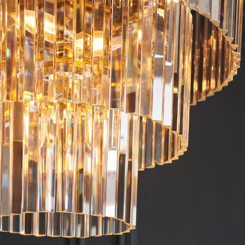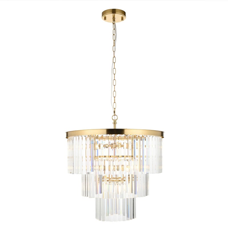 Add a touch of opulence to your home with this 5-light E14 ceiling pendant. Opulent and eye-catching, this seven-light pendant is a true statement piece featuring cascading tiers of angled glass droppers that shimmer with elegance. The sculptural design is crowned by a shaped metal band in a lustrous brushed brass finish, bringing structure and contrast to the fluid glass arrangement. Suspended from a height-adjustable chain, it offers a luxurious focal point ideal for grand entryways, lounge, bedrooms, dining rooms, or stairwells.