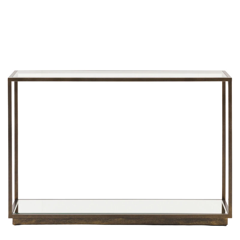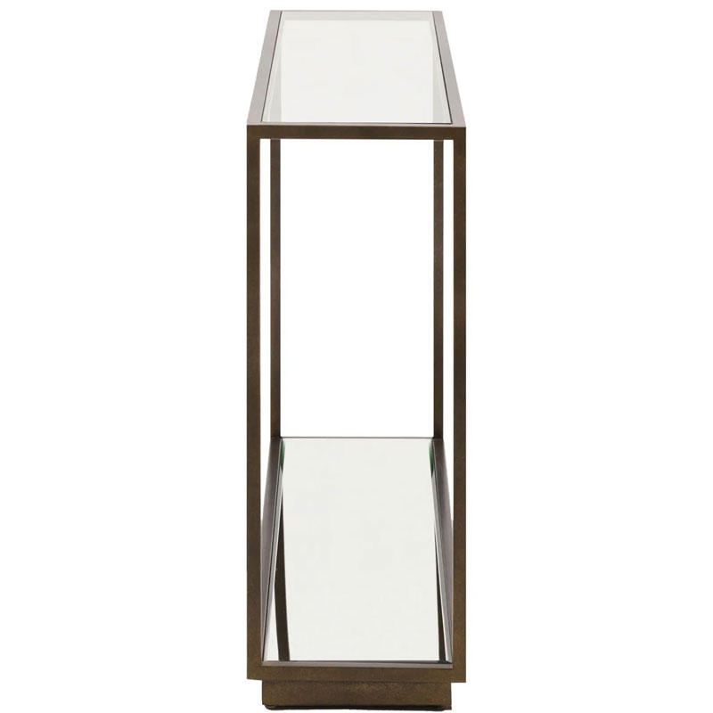 Antique Bronze Metal And Clear Glass Rectangular 2 Tier Slim Console Table With Mirrored Lower Shelf 120cm