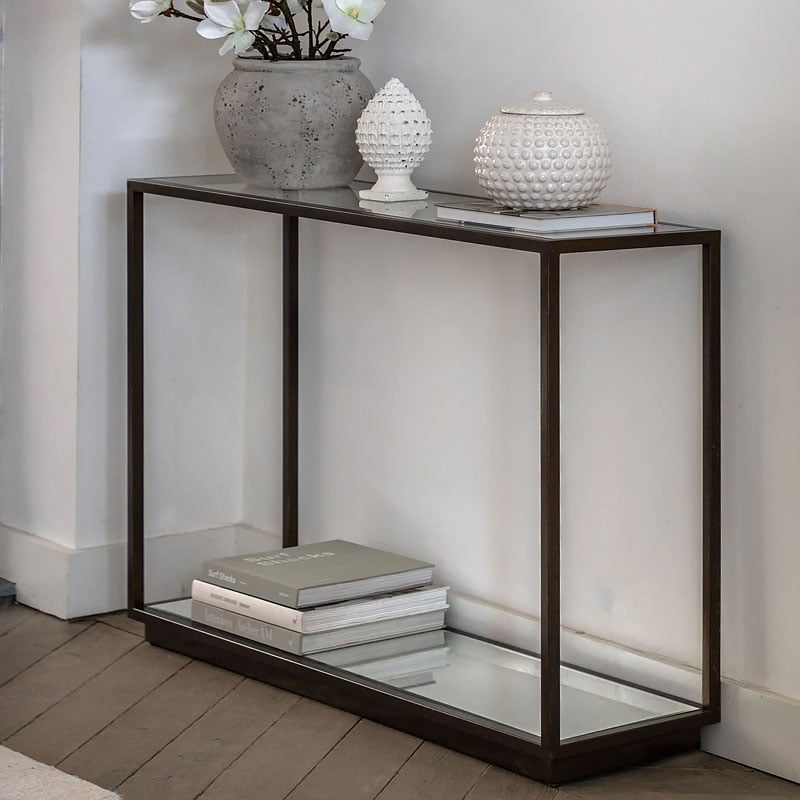 • The clean lines of the bronze metal frame complements the glass top and a lower mirrored shelf.