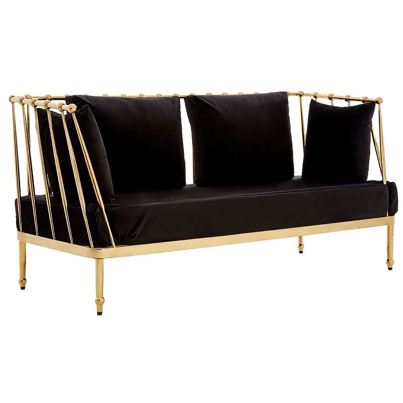 Art Deco Gold Metal And Black Velvet Tubular Design 2 Seater Sofa 170cm