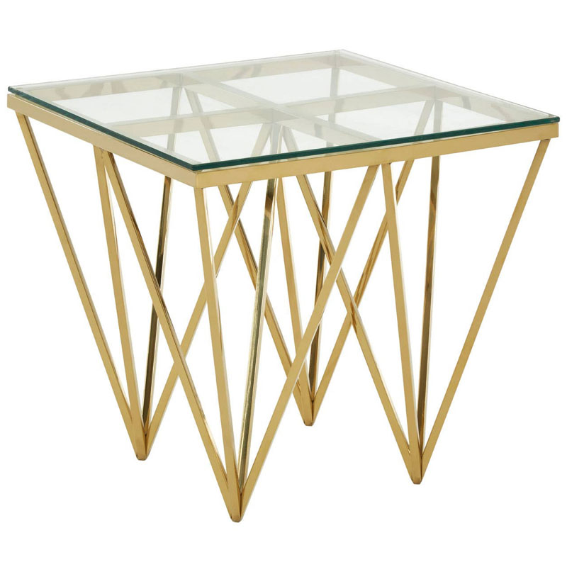 This is a chic and elegant side table with a striking, sculptural design. It features a clear, glass top that rests on an intricate geometric base. The base is composed of a series of polished gold-toned metal rods that are angled to create a modern pattern, making it a beautiful and functional accent piece.