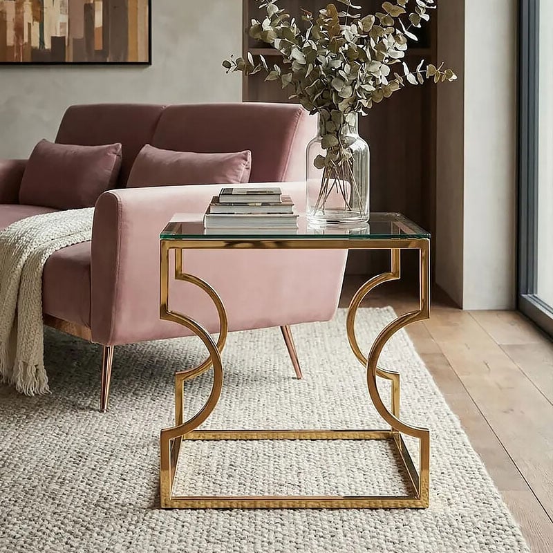 A modern luxe accent, this end table features design lines inspired by glamorous art deco style. Semi-circular indents at each side subvert the angular lines of this end table. Made from smooth stainless steel, the frame has a gold finish that makes the table easy to pair with warm metallic accessories. The table is topped by square pane of clear tempered glass.