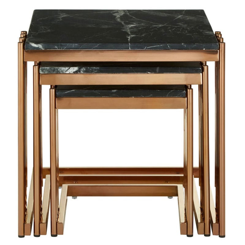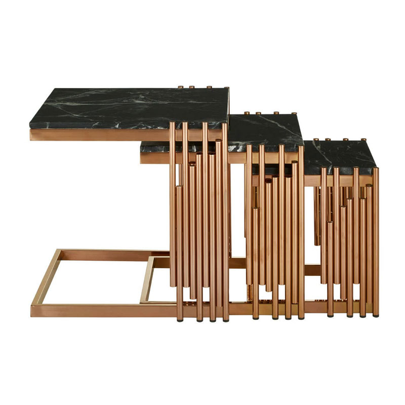 Art Deco Piping Detail Set Of 3 Rose Gold Metal Square Nesting Side Tables With Black Marble Tops