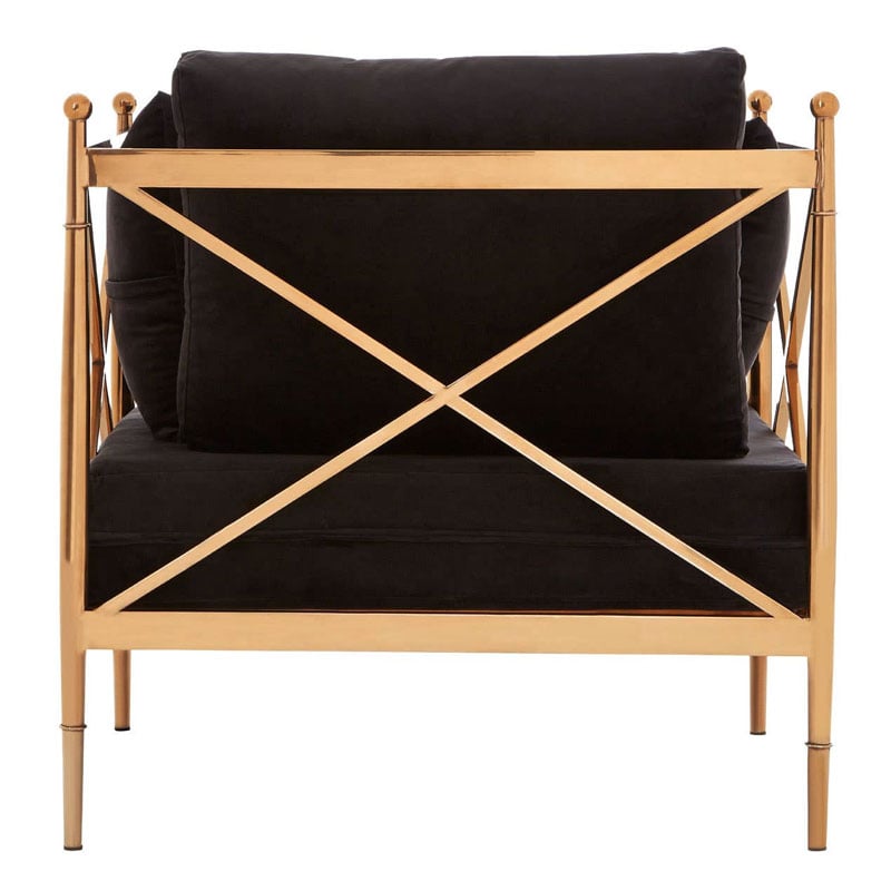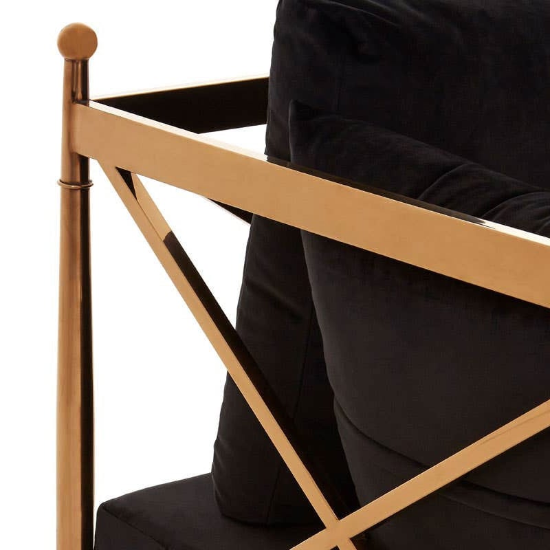 • The metallic body is counterpointed by the lush black velvet that upholsters the seat and three cushions, creating a soft textured finish.