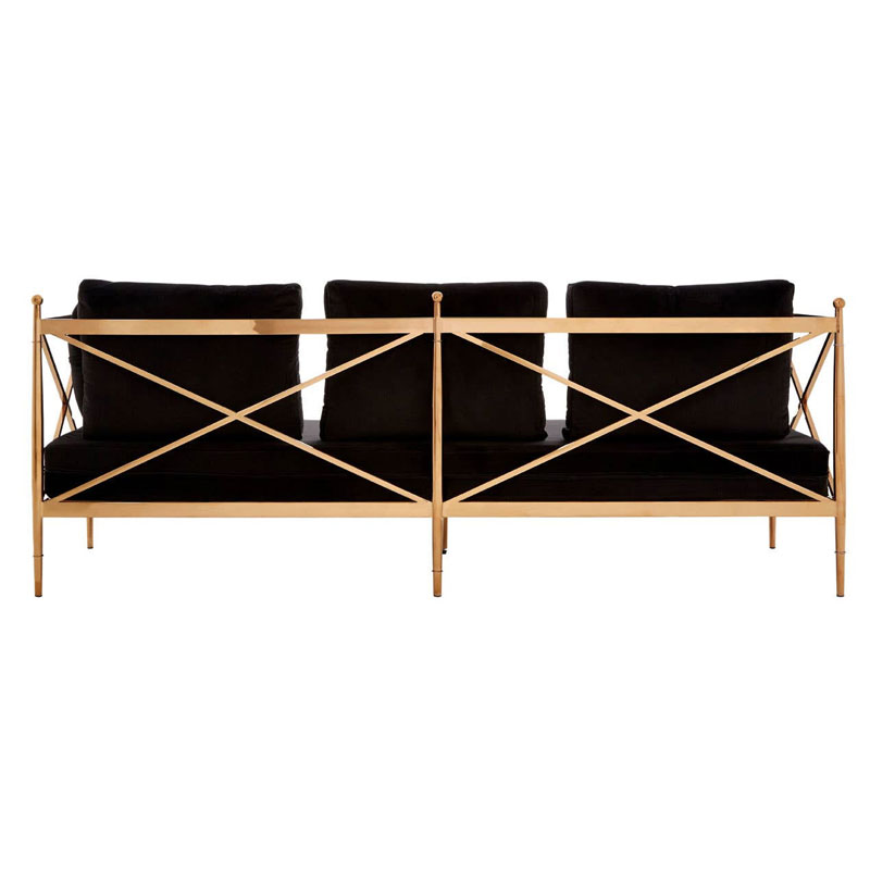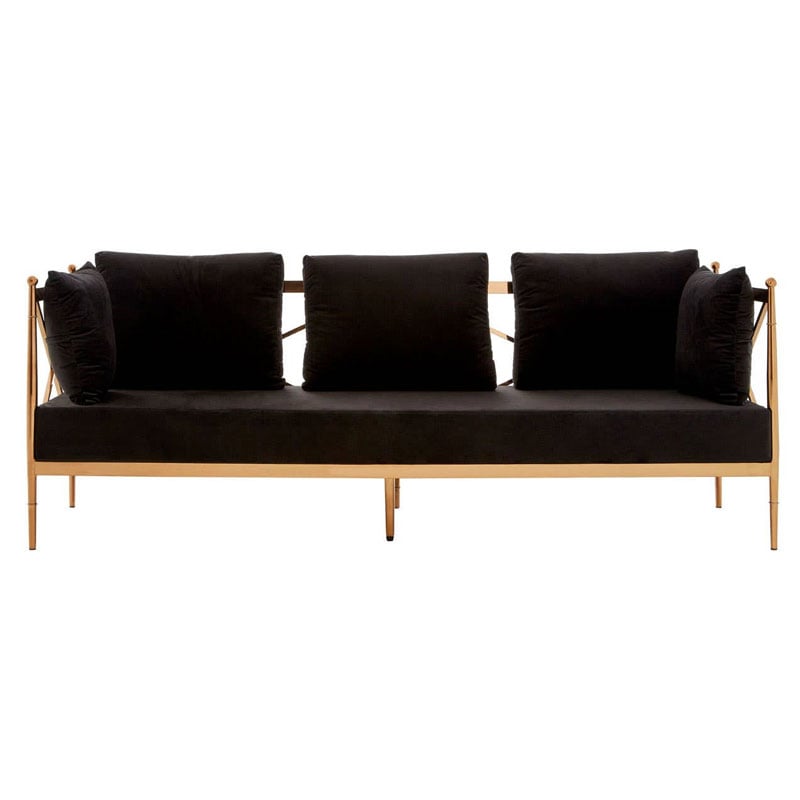 Art Deco Rose Gold Metal And Black Velvet 3 Seater Sofa 210cm