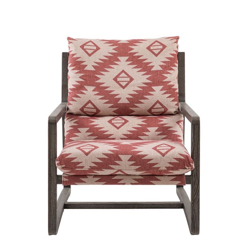 - Upholstered in a striking red & natural Aztec pattern fabric with a dark wooden frame, this lovely chair would suit a wide range of interiors.