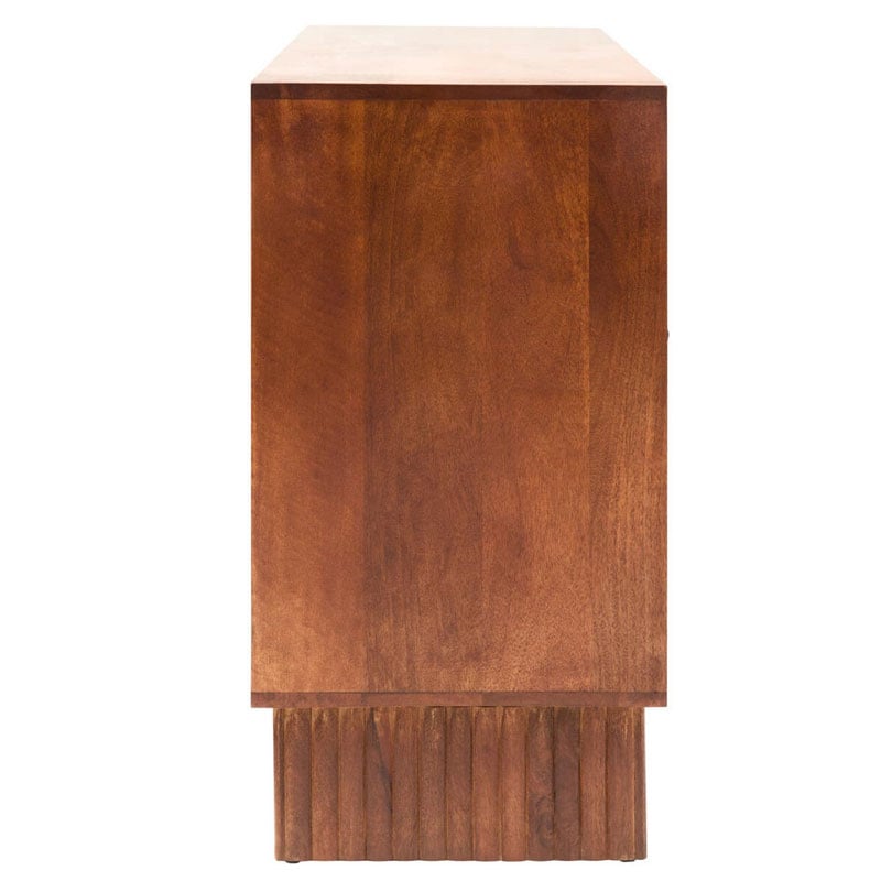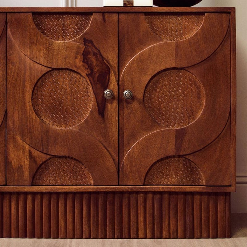 - This Boho four-door mango wood sideboard features a carved pattern and an interlocking motif that creates a sense of visual flow and movement.