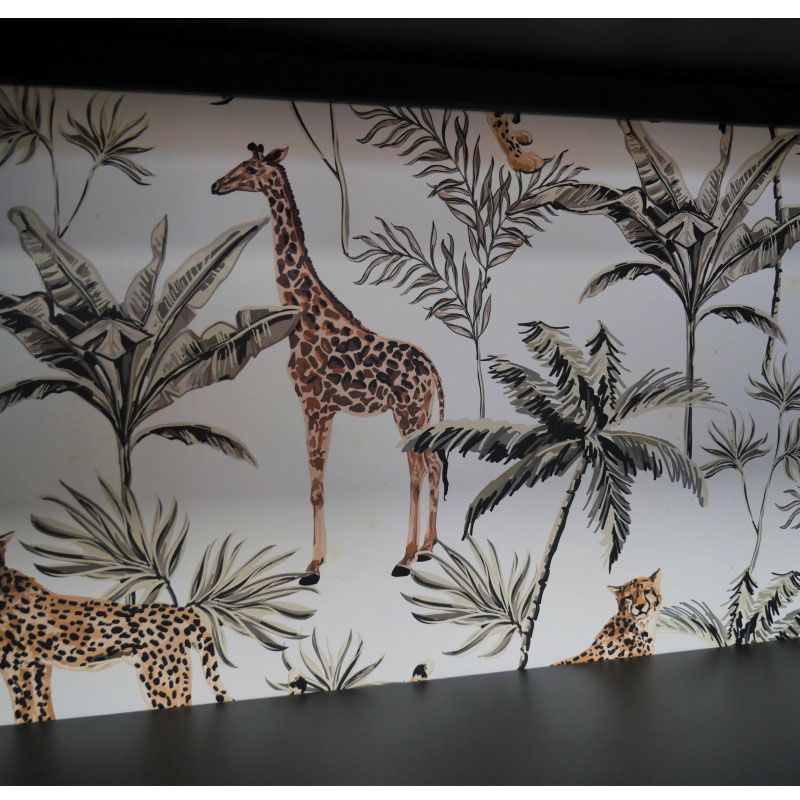 - The inside back of the cabinet showcases a beautiful illustrated giraffes and cheetah design on a wood backing board.