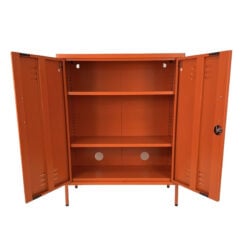 This Boho Industrial Burnt Orange Metal Locker Style 2 Door Cabinet brings a soft, playful charm to your storage needs. With its two lockable doors and adjustable shelves, this metal locker cabinet is ideal for keeping everything from accessories to household items tidy and secure. Add a touch of colour to your space while staying organised with this locker style cabinet. Its features – including a magnetic surface, handy hooks, wall mounting holes, and adjustable feet – make it both practical and versatile.