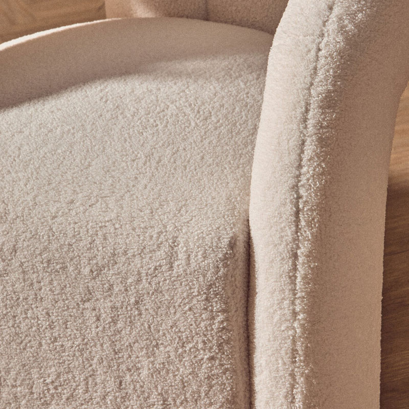 - The ivory boucle upholstery with its sumptuously tactile surface offers comfortable seating.