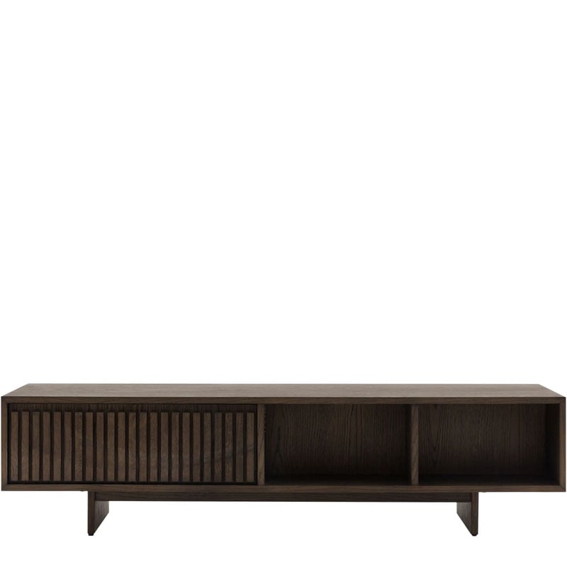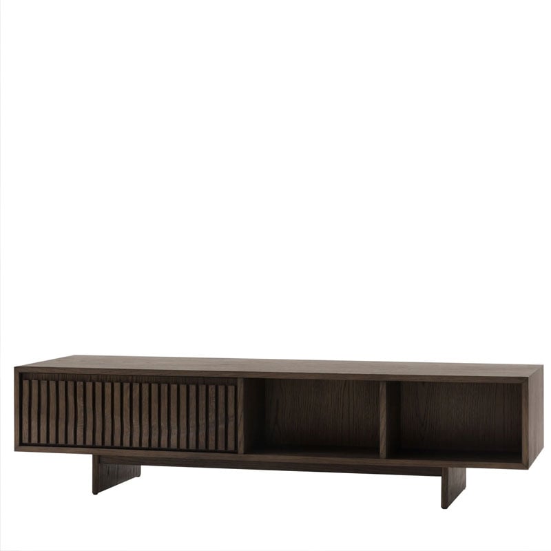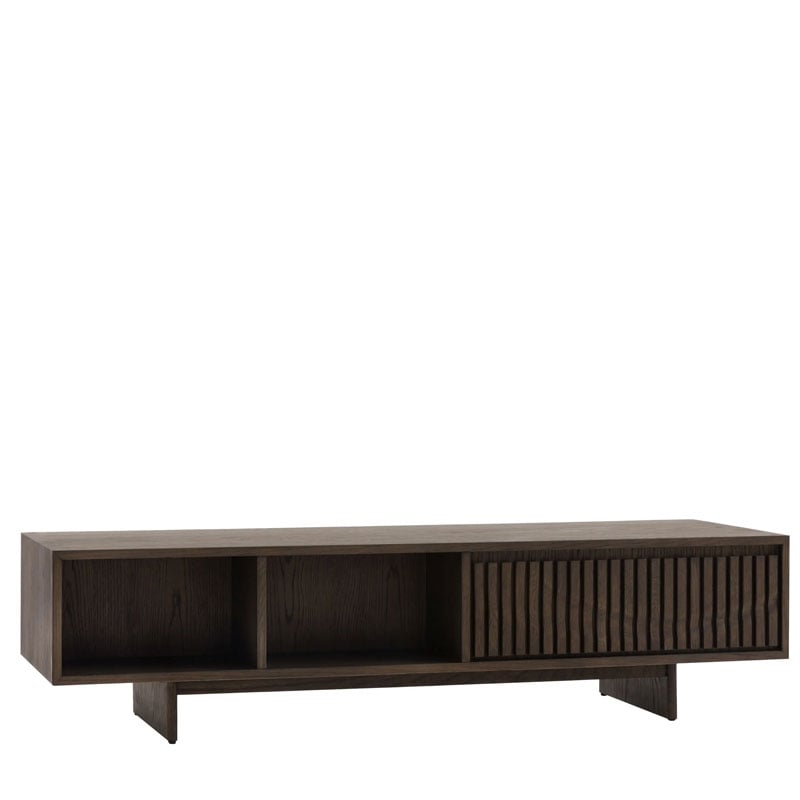 - The high quality oak solids & veneers in a rich charcoal brown polish highlight the unique slatted wave patterned drawer and sleek form.