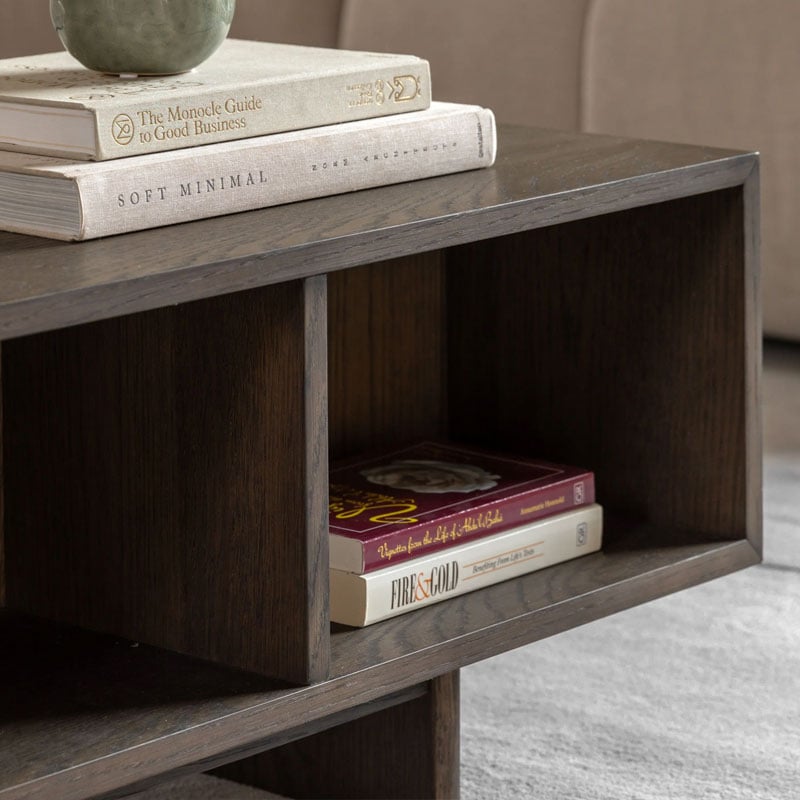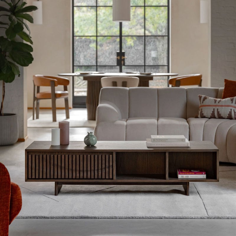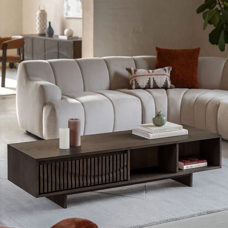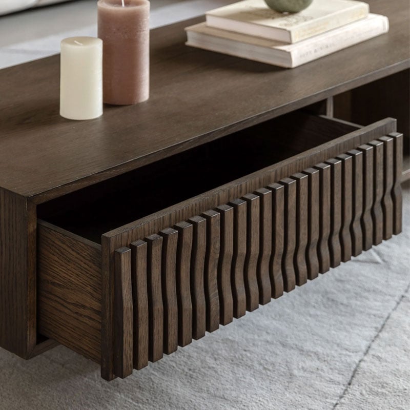 Distinctly Italian in design, this coffee table effortlessly adds style and sophistication to a living space. The high quality oak solids & veneers in a rich charcoal brown polish highlight the unique slatted wave patterned drawer and sleek form. With a single drawer and sectioned shelf, there’s plenty of storage space, adding functionality to the modern, stylish design.