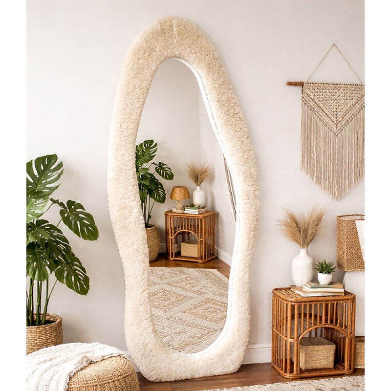 Why we love this Boho Quirky Wavy Soft Beige Faux Fur Teddy Fabric Frame Leaner Full Length Mirror
