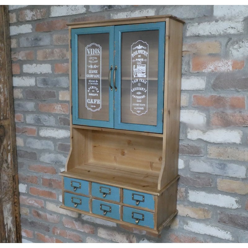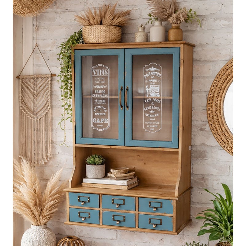 Enhance your kitchen with this boho rustic, solid fir wood multi-drawer apothecary cabinet. It is constructed from solid natural fir wood to deliver a resilient and robust structure. The space-saving wall-mounted design delivers multi-function uses, allowing you to categorise small items effortlessly while adding a rustic, artisanal feel to your home. It offers unique storage options with the multi-drawer array for smaller essentials, and the glass cabinet doors to reveal larger internal shelves for cookbooks or decor. The vintage-inspired filing cabinet drawer pulls and distressed blue-green finish add an authentic cottage design detail that creates a timeless, lived-in look.