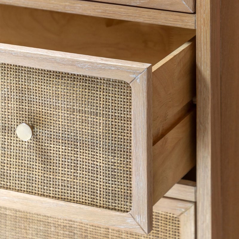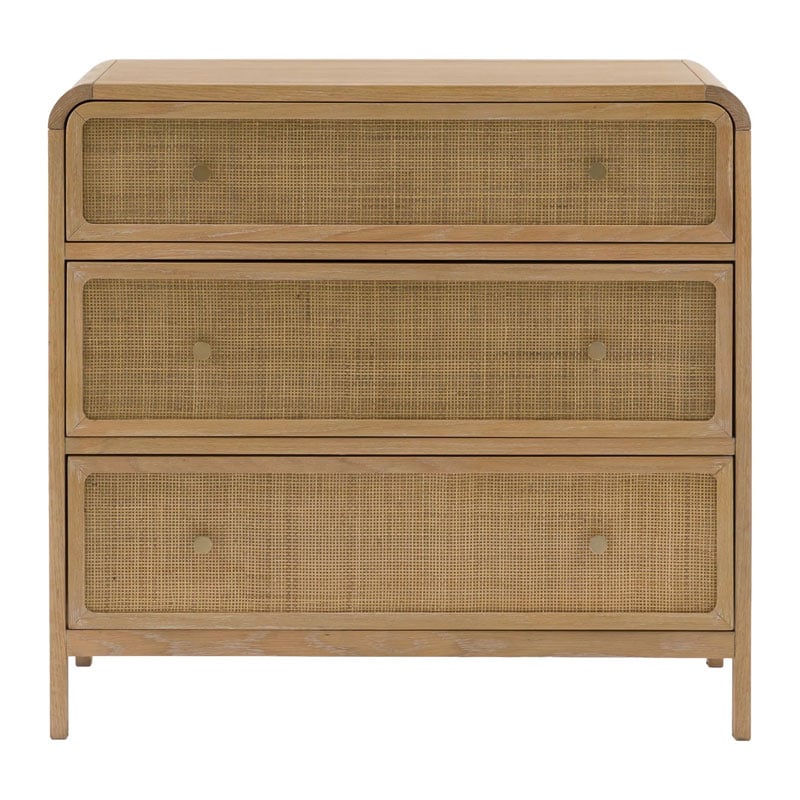 Bring a touch of rustic charm with this beautifully crafted chest; blending oak solids, veneers, and solid rubberwood timbers for durability and warmth. The standout feature being the natural hand-woven rattan, adding texture and an artisanal feel. Finished in a soft lime-washed tone, the collection has a relaxed, lived-in character. Gently curved tops lend a sense of softness, while bronzed metal handles add a subtle vintage touch. Perfect for creating a calming, timeless bedroom space with natural beauty at its heart.