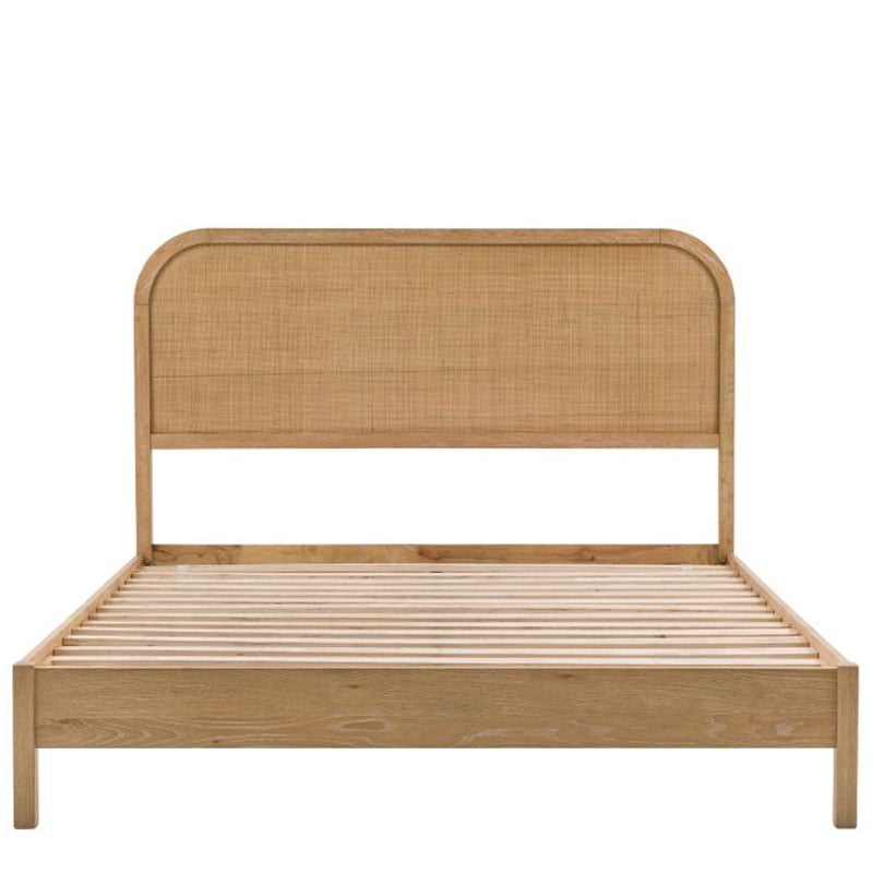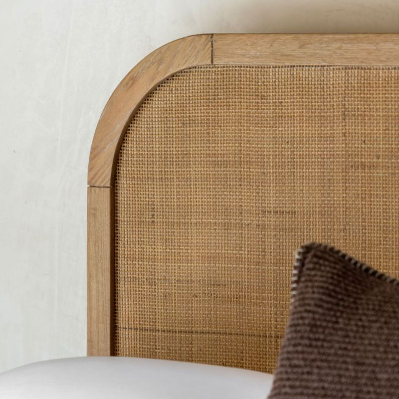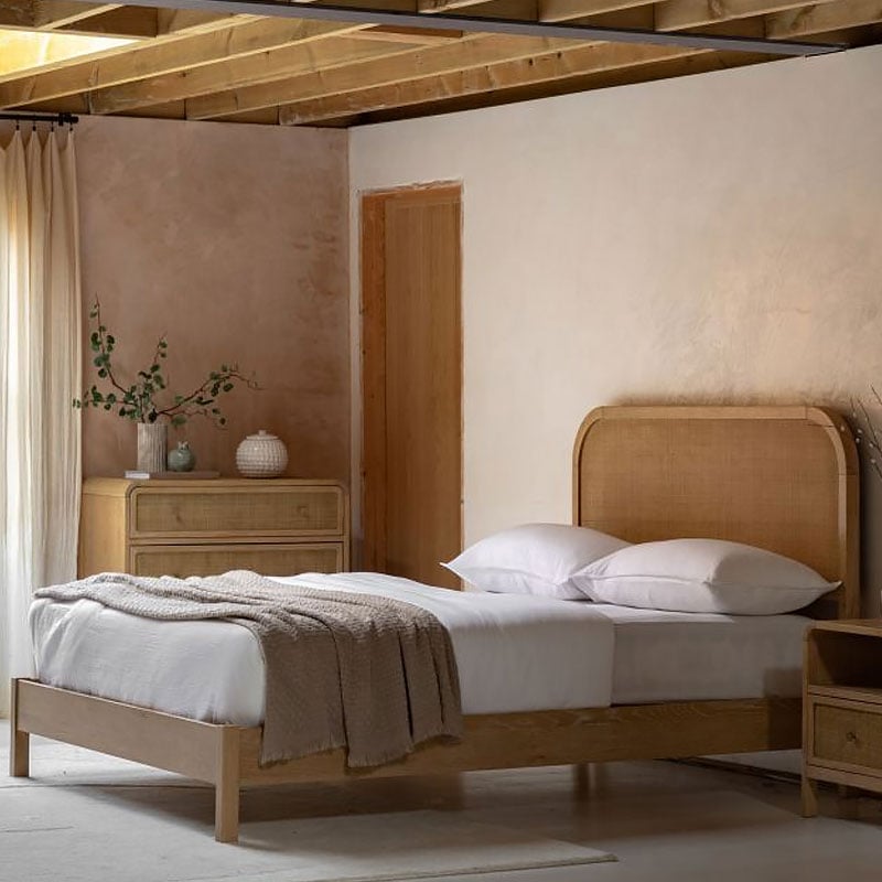 Bring a touch of rustic charm with this beautifully crafted bed; blending oak solids, veneers, and solid rubberwood timbers for durability and warmth. The standout feature being the natural hand-woven rattan panels on the headboard, adding texture and an artisanal feel. Finished in a soft lime-washed tone, the collection has a relaxed, lived-in character. Perfect for creating a calming, timeless bedroom space with natural beauty at its heart.