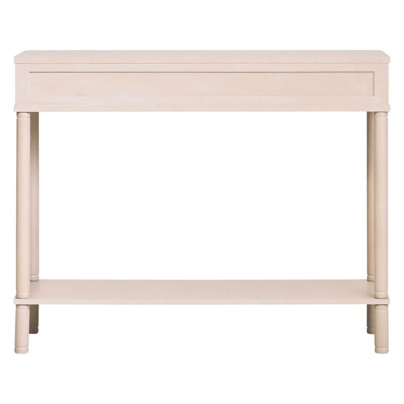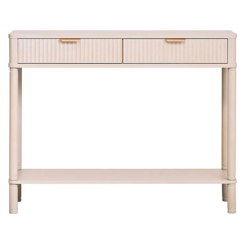 This console table features a taupe finish with reeded drawers front accented by a sleek gold-tone handle, perfect for adding a contemporary touch. This two-drawer console table is crafted from pinewood with its reeded drawer front, which adds depth and tactile detail. Each drawer has a gold-finish handle, adding a modern touch. Supported by four round legs, the lower shelf is perfect for displaying decorative accents, making it a perfect choice for any living space.