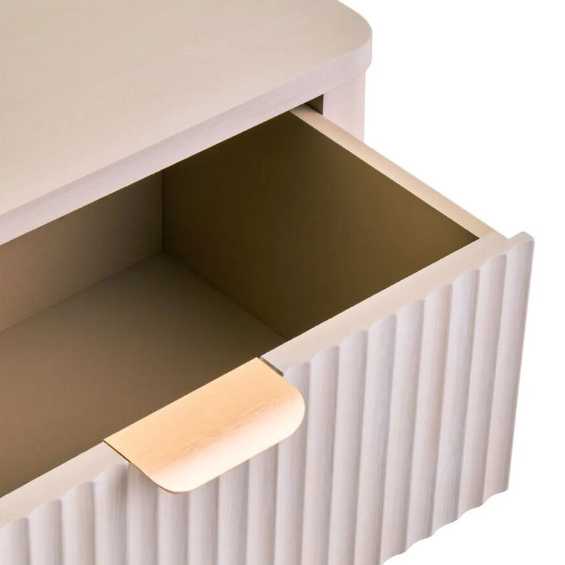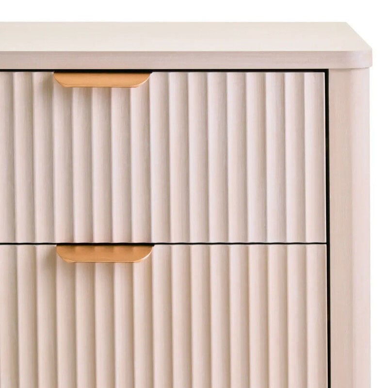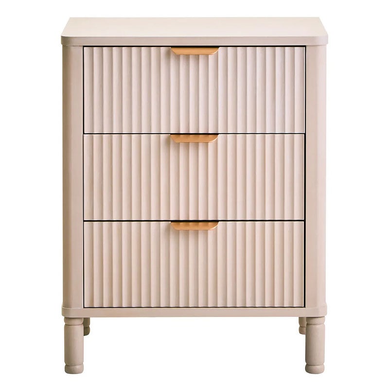 This three drawer bedside cabinet features a soft taupe finish and vertical reeding on the drawer fronts, a perfect blend of tactile design and practical storage. It showcases a unique reeded design across the front of its three drawers, adding visual interest and depth to the neutral taupe finish. Each drawer has a gold finish handle, providing a metallic contrast that enhances the aesthetic. Supported by sturdy, round legs, this bedside cabinet side table is suitable for any interior.
