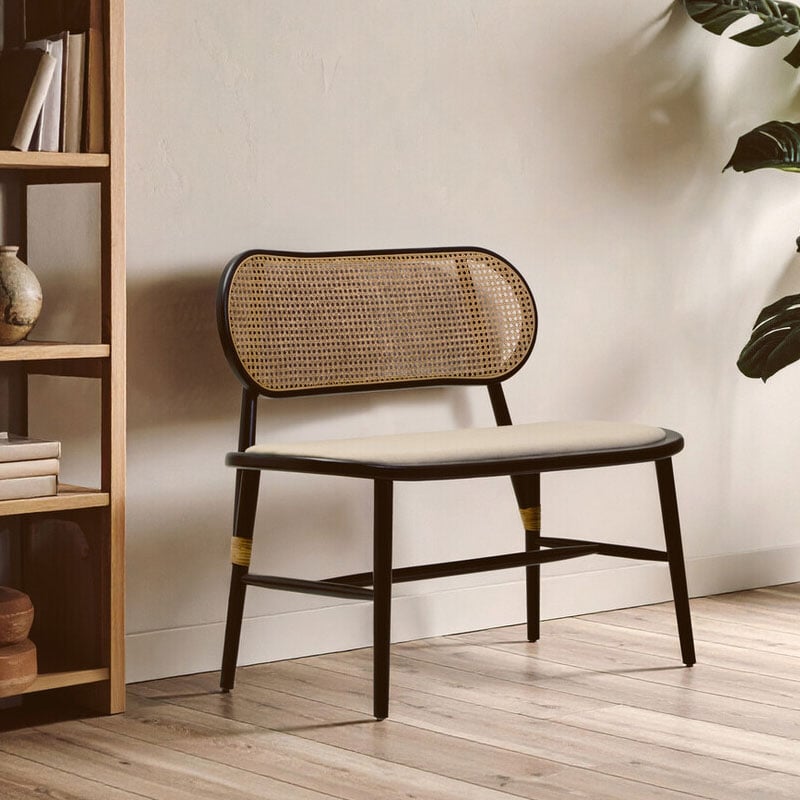 Blend natural sophistication with modern design in any space with this dining or hallway bench. Its natural cane woven backrest aligns with the soft beige fabric seat, offering both comfort and visual texture. The black elm wood frame adds a striking contrast and ensures sturdy support, making it perfect for entryways or living areas with a refined and airy aesthetic.