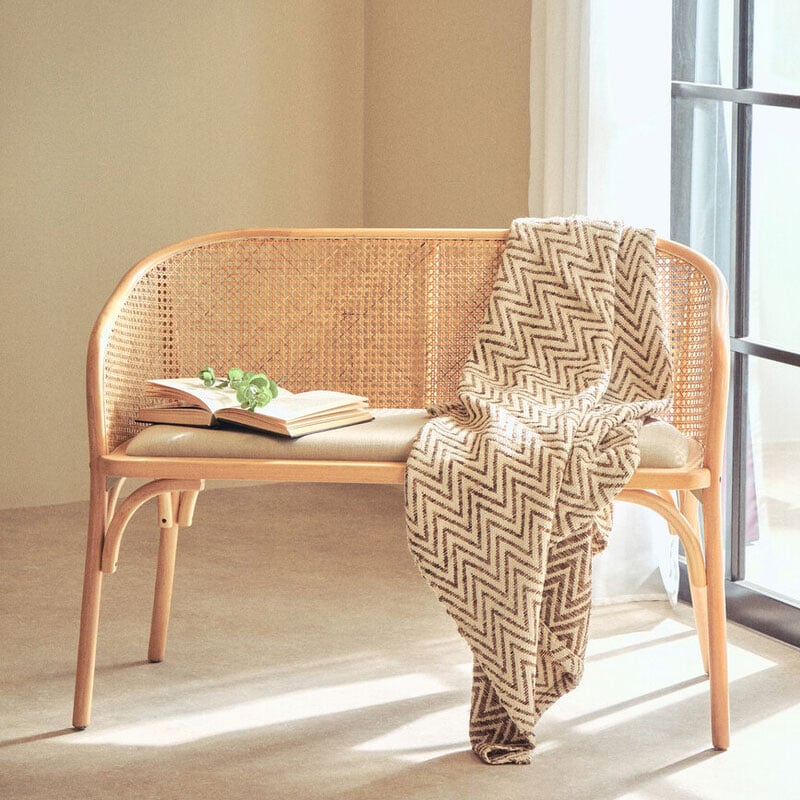• This contemporary bench has a curved beech wood frame complemented by a cane woven backrest and a beige padded seat.