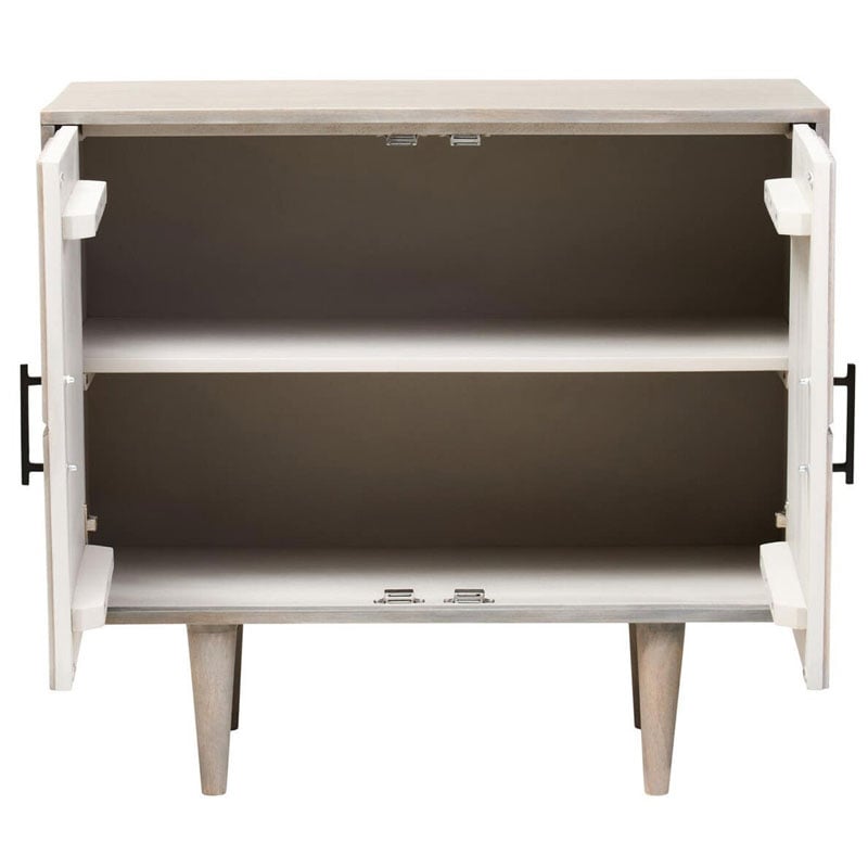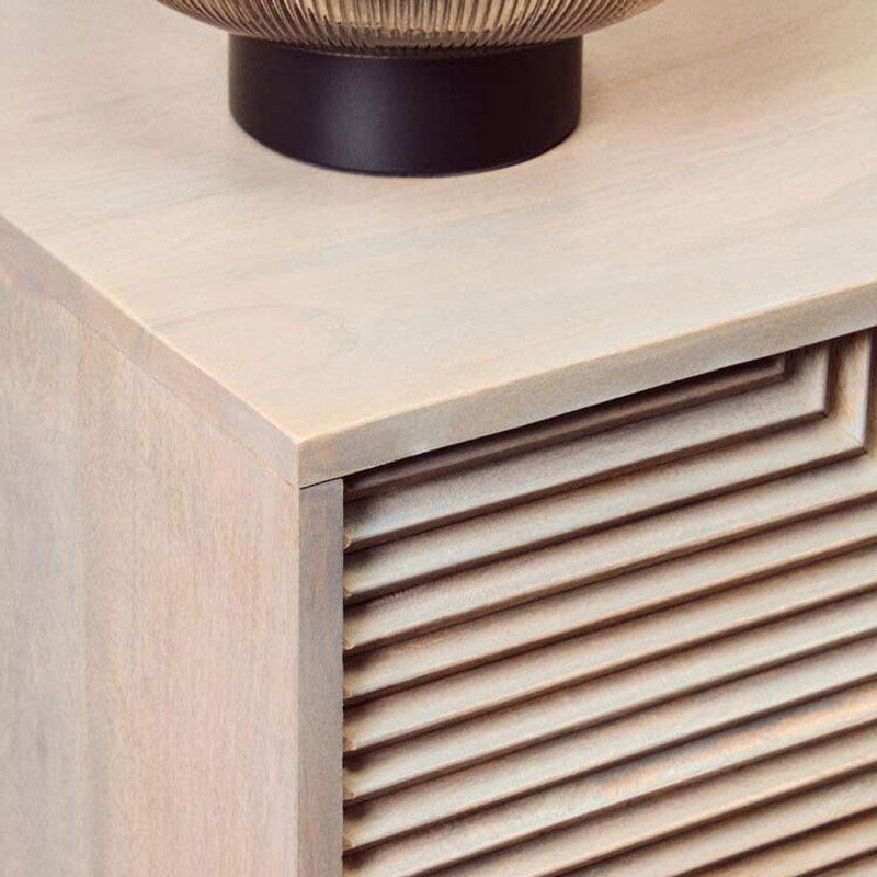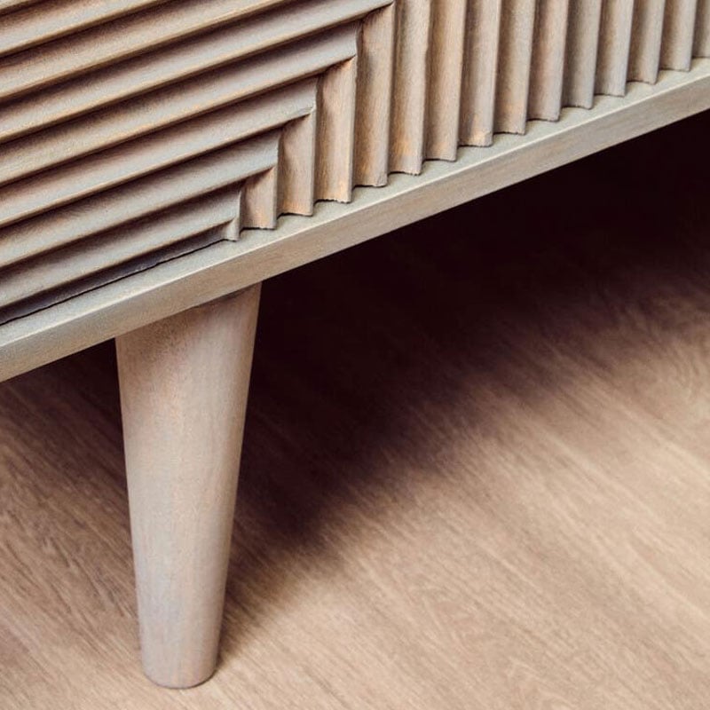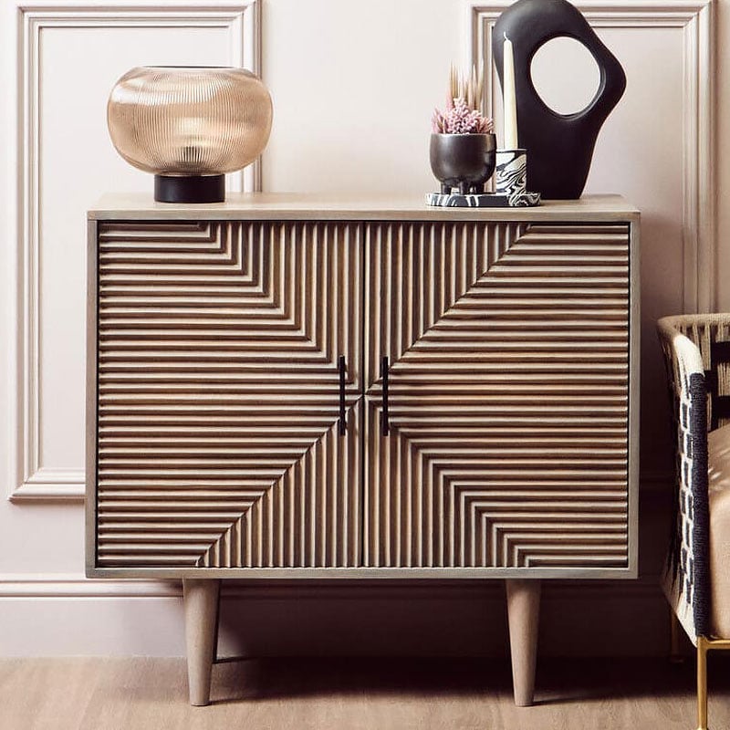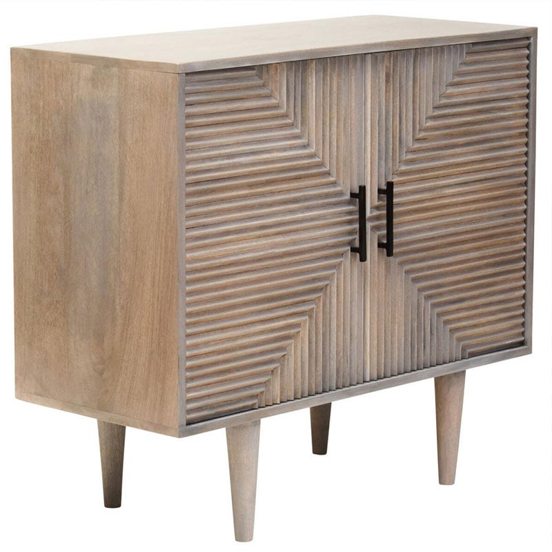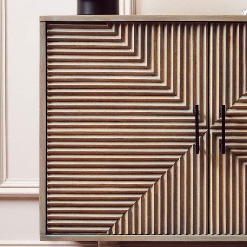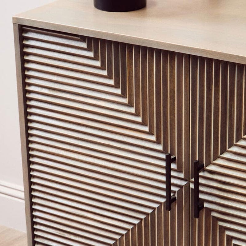 This Boho rustic two-door sideboard is crafted from greywash mango wood with black metal handles and beautifully carved detailing.