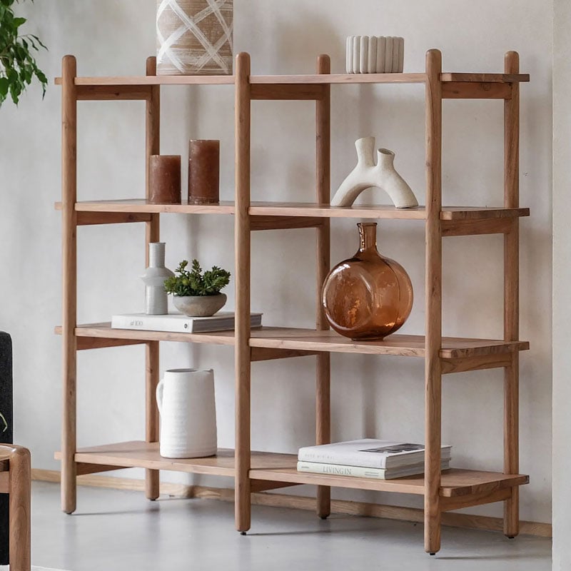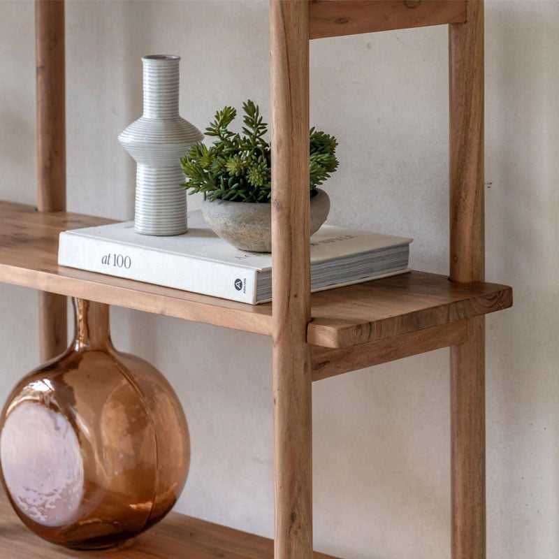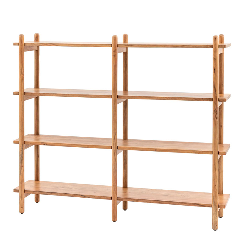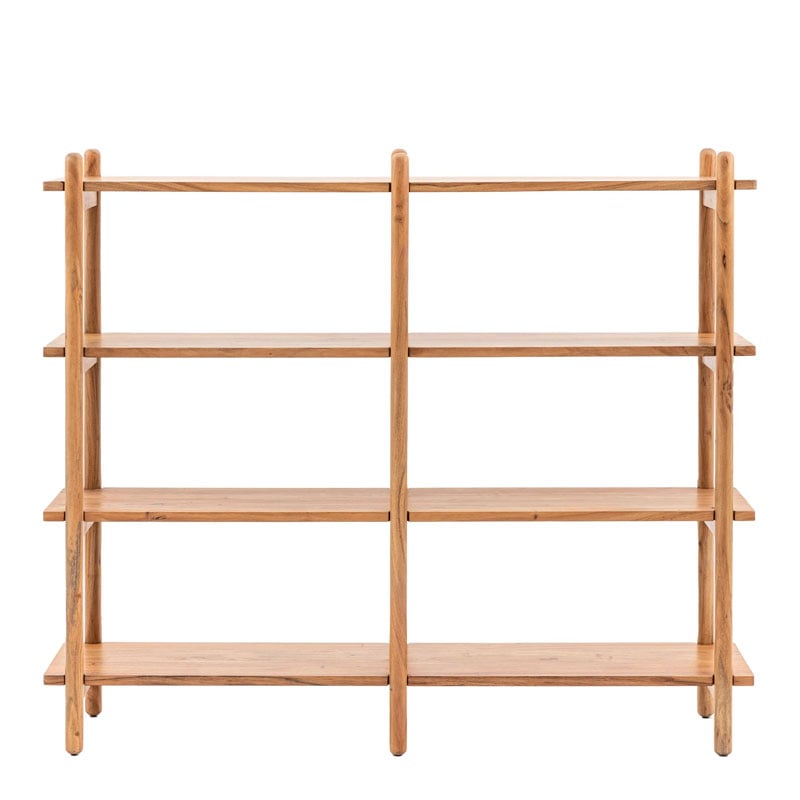 • Made from rich Acacia wood the wide 4 shelf unit has a clear vintage design influence with its slim shelves and rounded uprights, making it perfect for modern eclectic interiors.