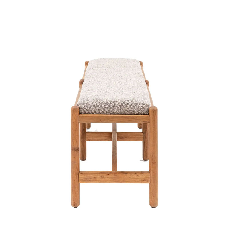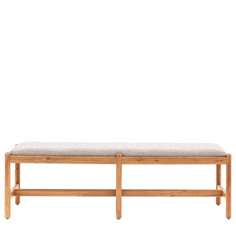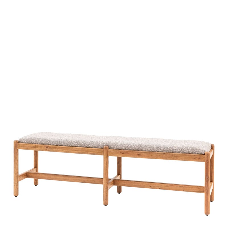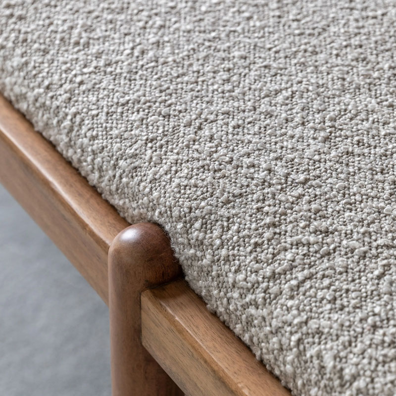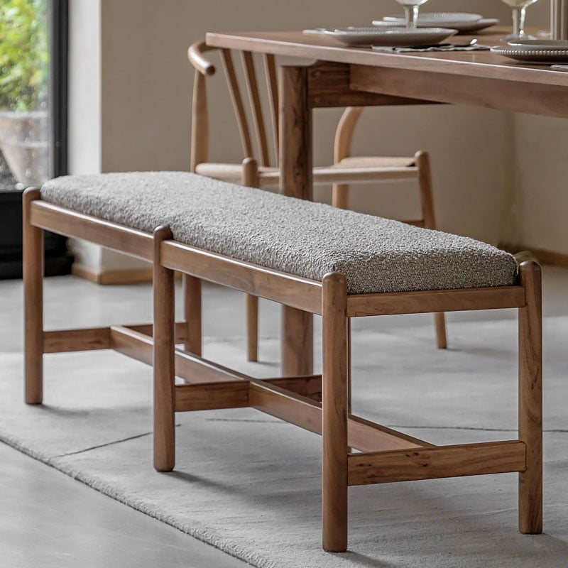 The perfect complement to our coordinating dining table this dining bench’s retro influence is clear. Giving a modern twist to the vintage inspired design the rich Acacia wood bench is upholstered in tactile grey Boucle fabric.