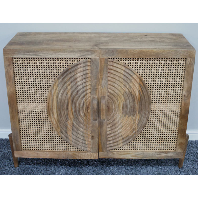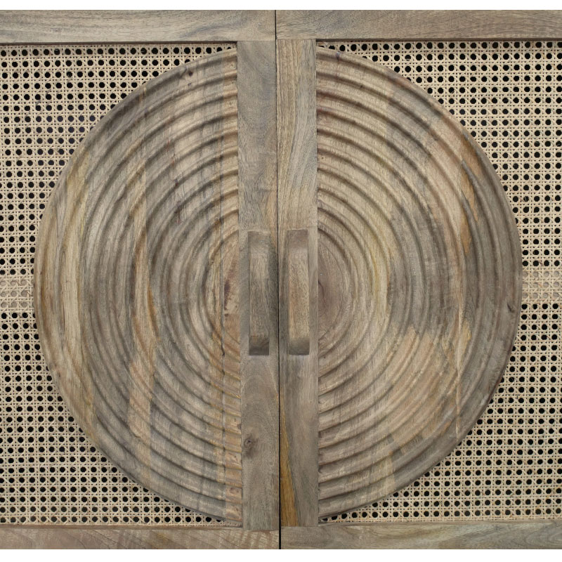 Introduce vintage allure into your interior with this boho rustic solid light mango wood and rattan carved sideboard cabinet. Its solid, light mango wood structure is sturdy and resilient, displaying a natural, earthy finish. The cabinet doors are a defining feature of this impressive cabinet as they display a circular central wood carving that sits against a natural rattan insert, adding texture and interest to this stylish sideboard. The internal shelf makes storage effortless within the cabinet, helping to keep your home clutter-free and tidy. It’s a striking piece that will create a focal point in any room as it adds rustic charm.