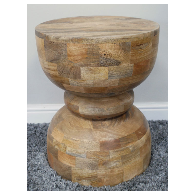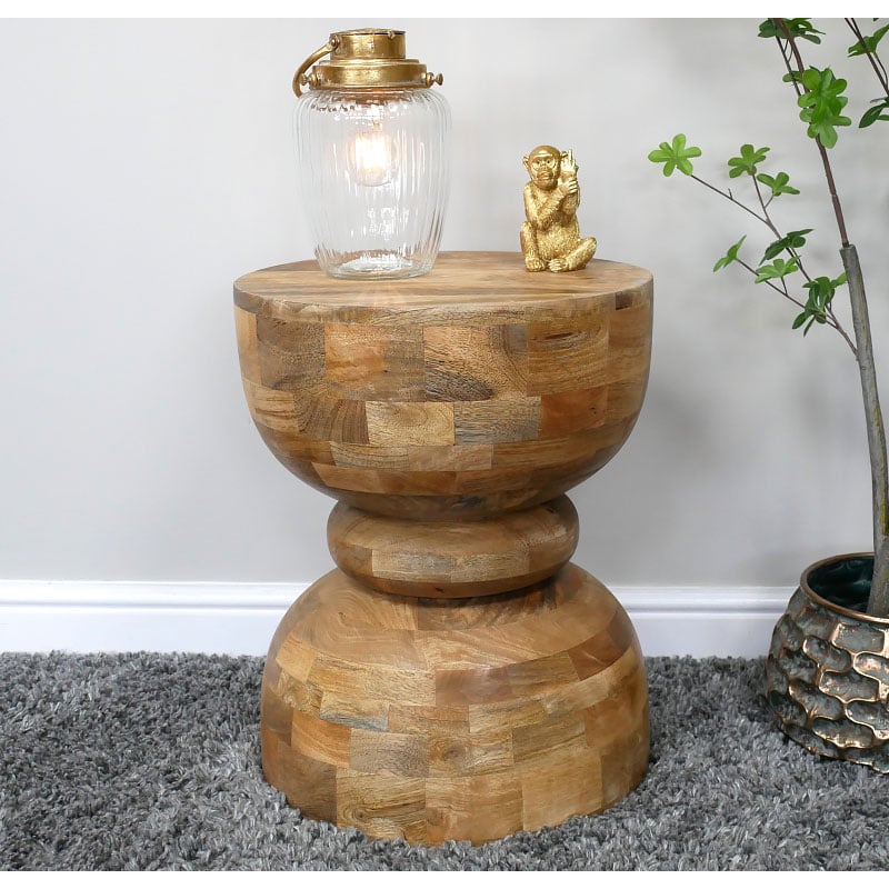 - Crafted from high-quality solid mango wood, this side table features a unique hourglass shape that adds a modern twist to any room.