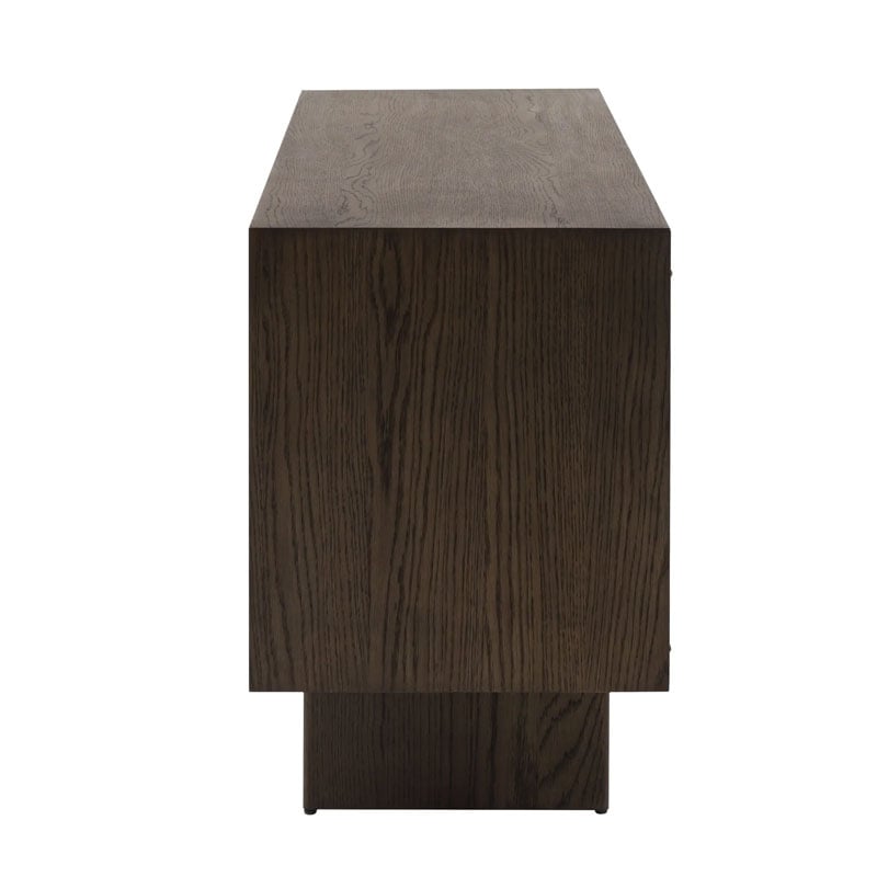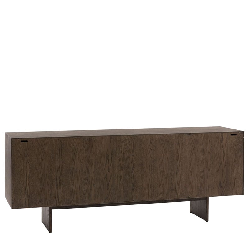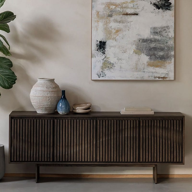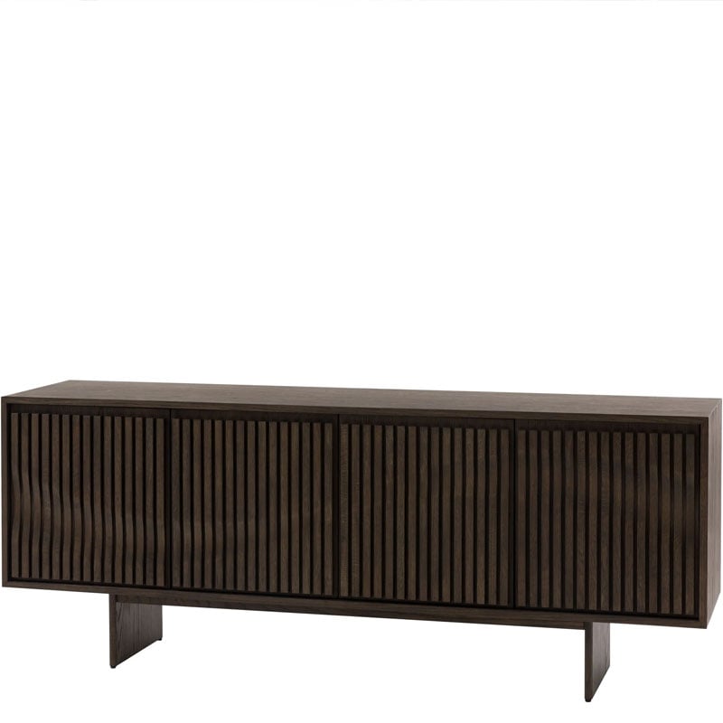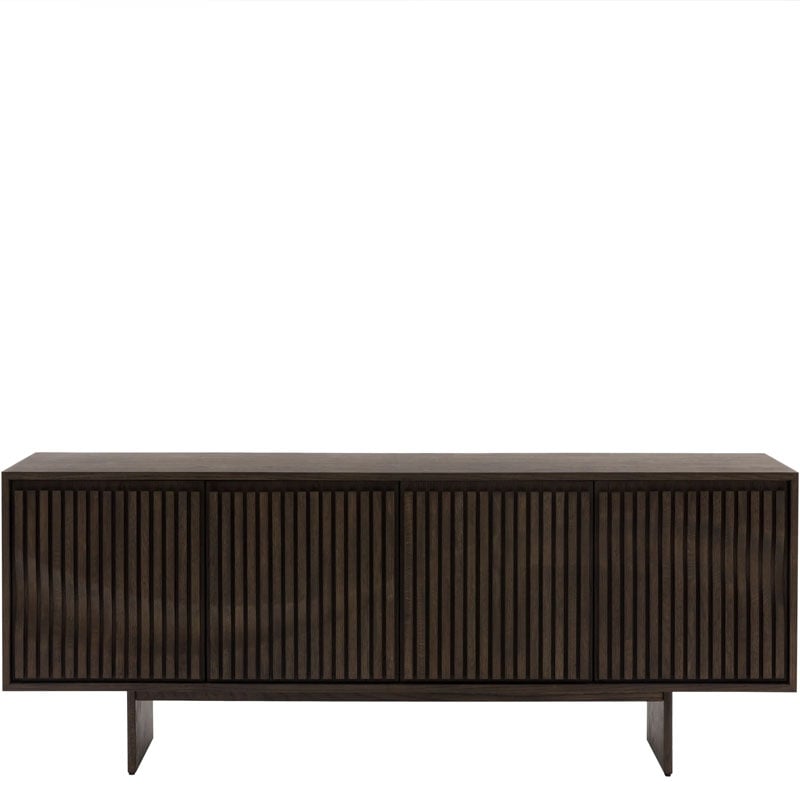 With a distinctly Italian influence and a contemporary edge, this 4 door sideboard brings effortless style to any living space. Crafted from high quality oak solids and veneers in a rich matt walnut brown polish, the door panels feature a unique slatted wave pattern across the front, creating a sophisticated and modern aesthetic. With plenty of practical storage, this sideboard effortlessly balances style and functionality.