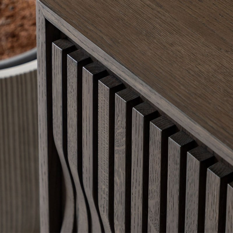- Crafted from high quality oak solids and veneers in a rich matt walnut brown polish, the door panels feature a unique slatted wave pattern across the front, creating a sophisticated and modern aesthetic.
