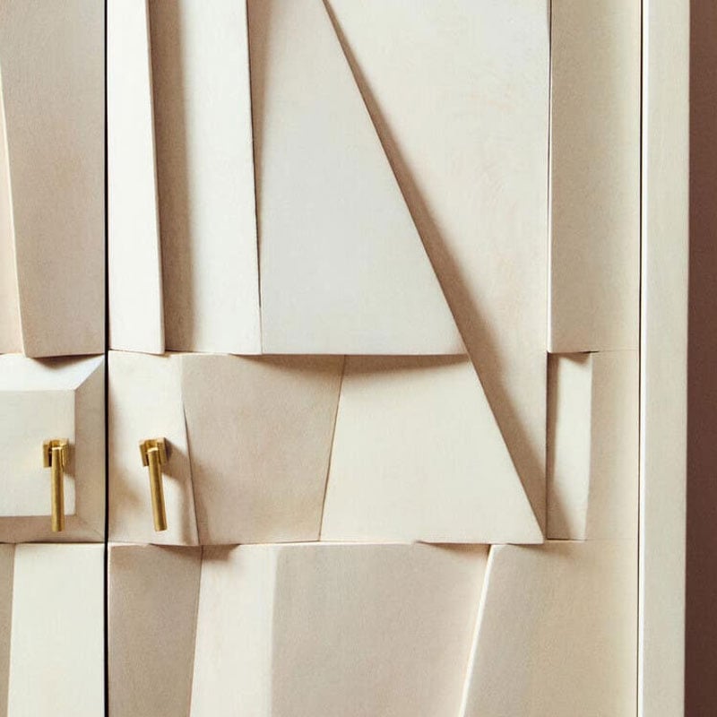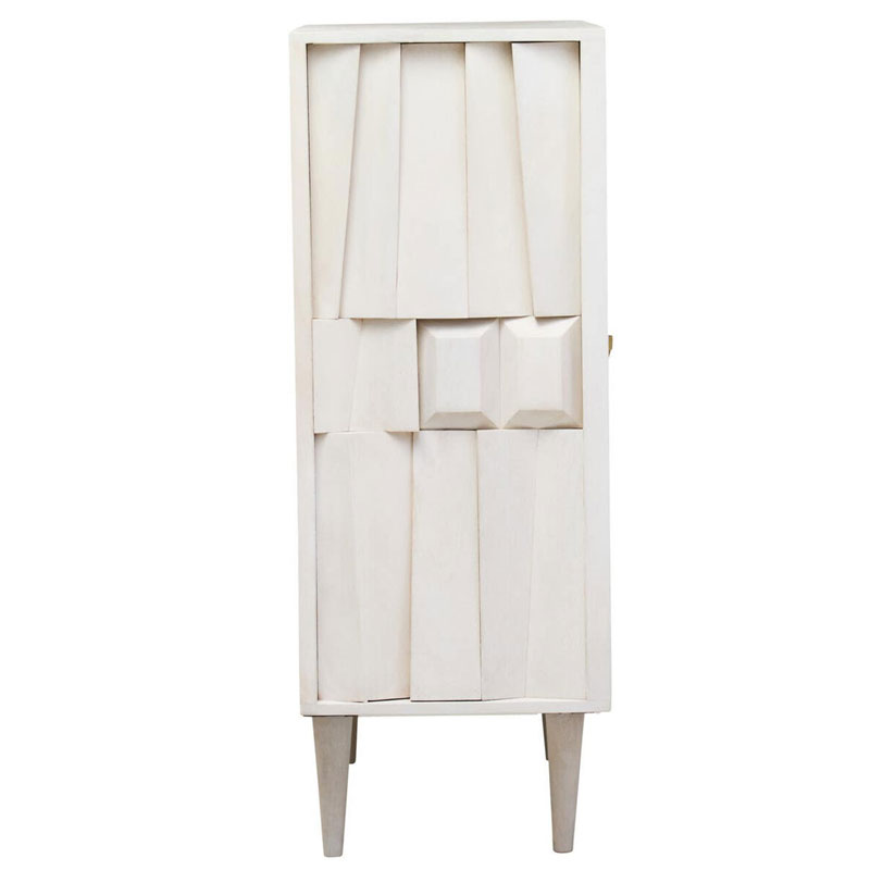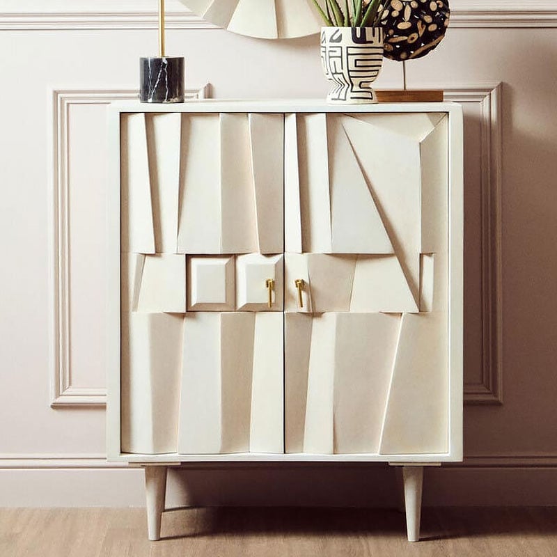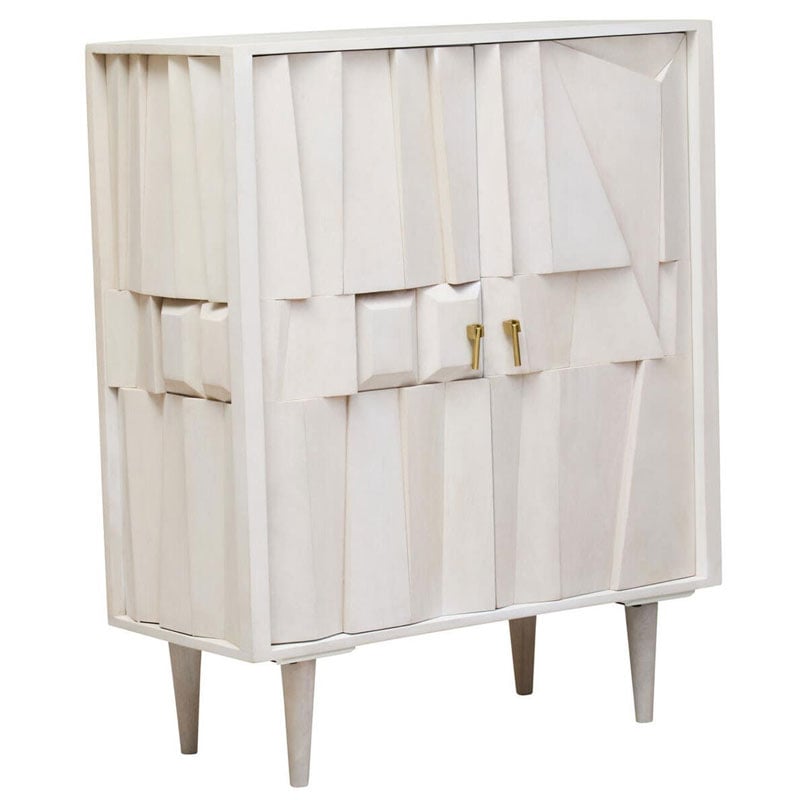 • The doors are the focal point, showcasing an abstract tile design carved into the wood, creating textured surfaces that add depth and visual interest to the cabinet’s exterior.