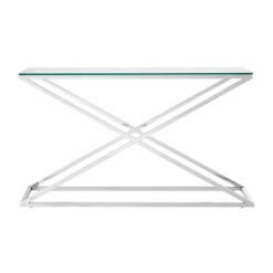 Why we love this Contemporary Cross Base Silver Chrome Steel And Clear Glass Console Table
