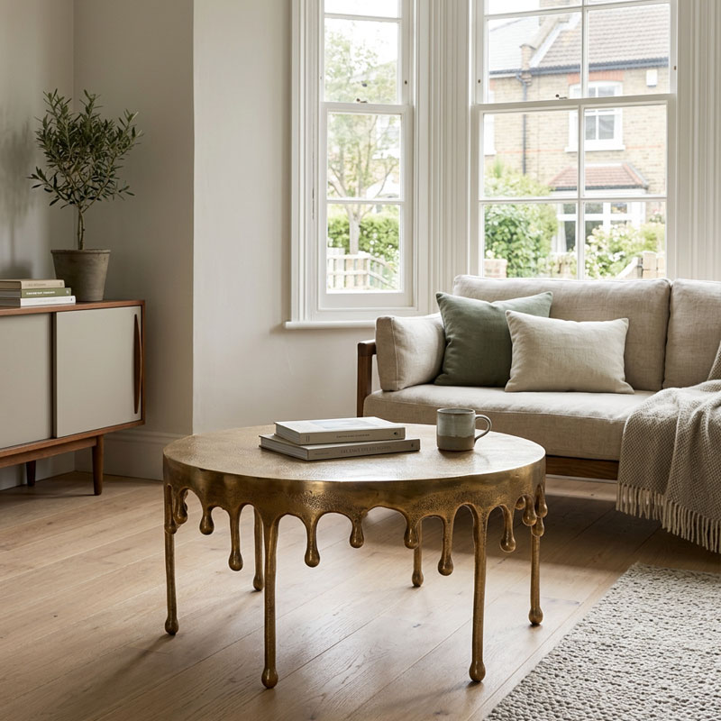 Embrace an artistic style with this Antique Gold Aluminum Coffee Table 40cm. It highlights the stunning falling drop design and offers a minimalist aesthetic. It is made from aluminium with a chic antique gold finish. This hand-crafted table features minor imperfections and variations that are part of the slightly textured design. This round table offers a large surface space and stands out with its beautiful sculptural appearance. It is a stunning centrepiece for your living or entertainment space.