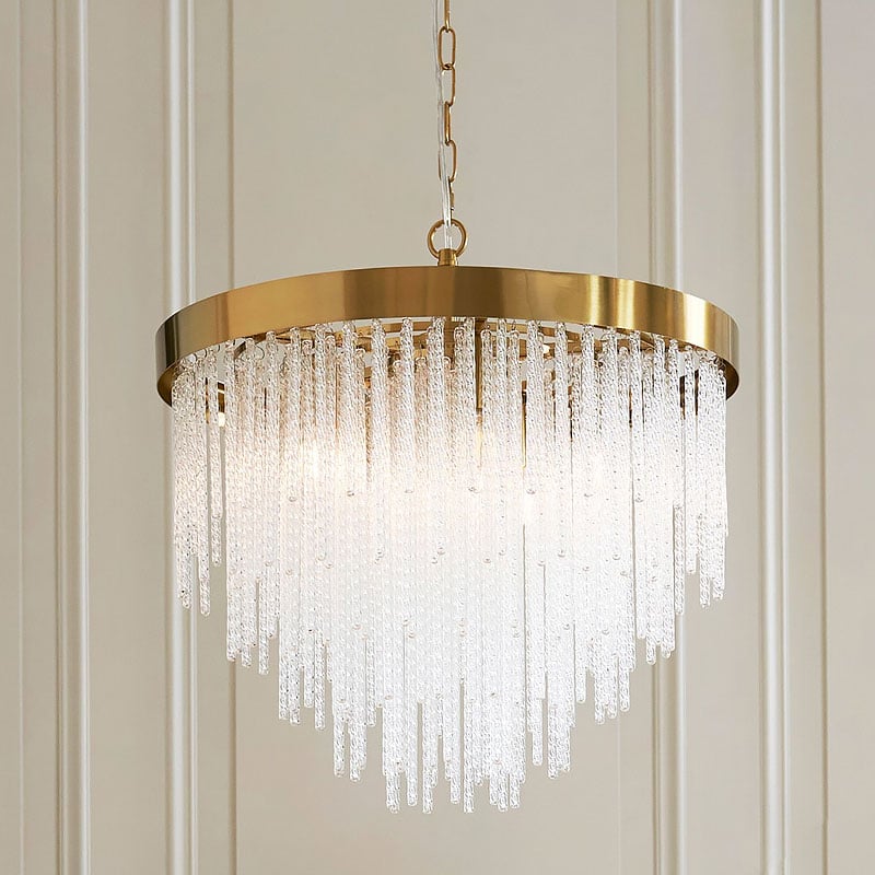 - Featuring a warm brass-finished frame and an elegant arrangement of elongated, textured glass rods, this statement piece creates a dazzling cascade of light.
