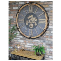 It is an industrial black metal and wood exposed gold moving gears large wall clock with a marble effect face that will add interest and character to any wall. This impressive wall clock sits stylishly within a slim wood and black metal frame that delivers a dynamic urban aesthetic. The exposed moving gears to the clock’s centre are a defining feature that adds a classical, contemporary aesthetic. The black marble effect surround adds texture and interest to the clock, creating a striking backdrop for the gold Roman numerals and clock hands to sit off.