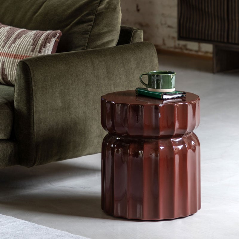 A standout stylish addition to any room, from living space to bedroom this side table won’t go unnoticed. The bold modern ridge pattern, sectioned top, and deep rust brown glazed finish make this a perfect piece for a contemporary home.