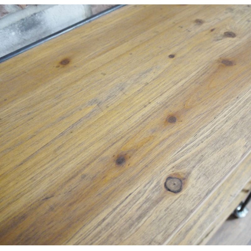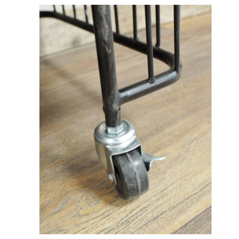 - Distressed black metal and golden fir wood combine to create this elegant shelf unit / drinks trolley.