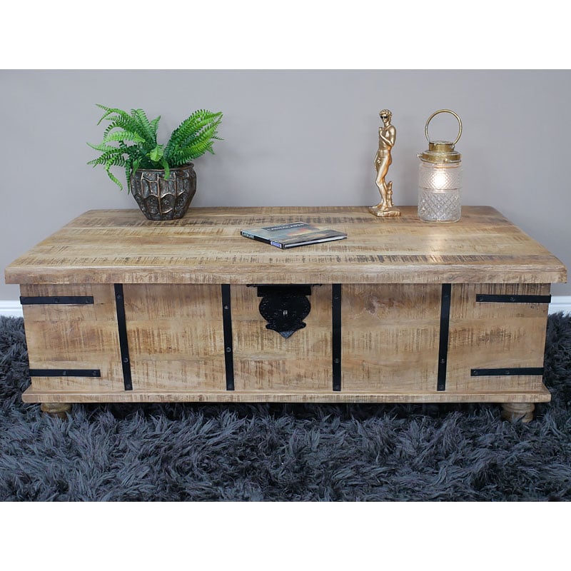 - It is an industrial rustic solid light mango wood trunk lift top storage coffee table that offers the best of both worlds.