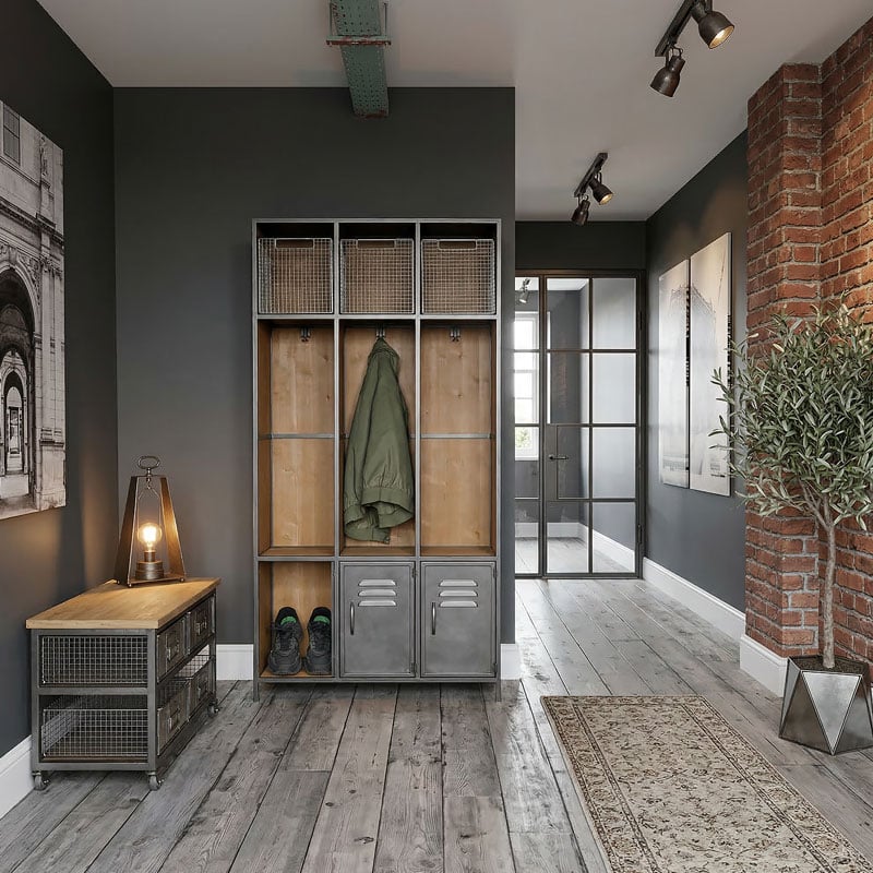 Introduce rustic appeal to your entrance hall with this steel grey metal and solid wood three door crate hall stand coat hanger. This impressive cabinet is carefully crafted out of metal and finished in steel grey to create this impactful design. The solid wood lining contrasts sharply with the grey metal, adding a warm and inviting finish to this stylish cabinet. This impressive cabinet is the perfect addition to any entrance hall as it delivers coat-hanging storage, shoe storage and more whilst providing a chic aesthetic.