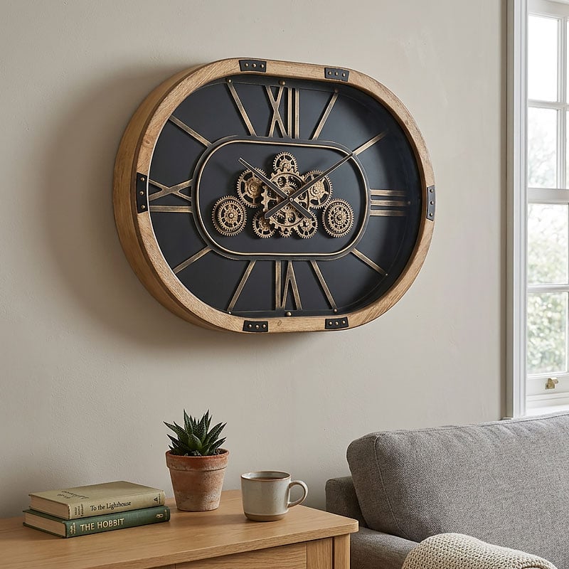 Add interest and charm to your wall space with this large oval natural wood gold moving gears wall clock with a black dial. Its uniquely oval shape delivers a quirky form to this stylish piece. The natural wood finish surround delivers traditional warmth that stylishly contrasts with the antique gold effect roman numerals effortlessly displayed around the perimeter. The central moving cogs are a focal point to this edgy wall clock, as they move around the centre, showing a quirky, fascinating charm to this stylish wall clock.