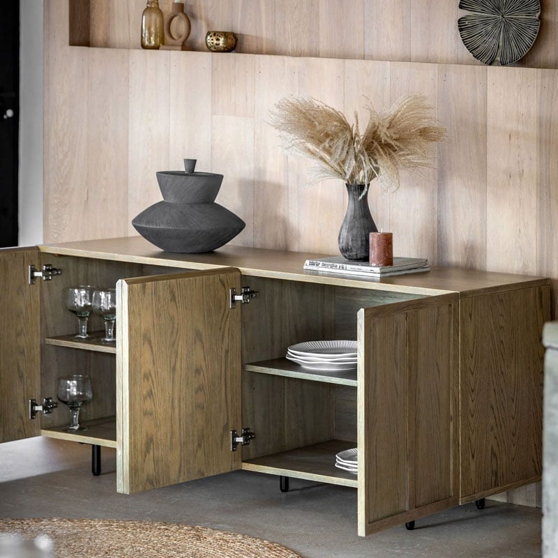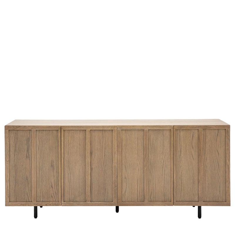 Why we love this Retro Industrial Panelled Smoked Light Oak Wood And Black Metal 4 Door Large Sideboard