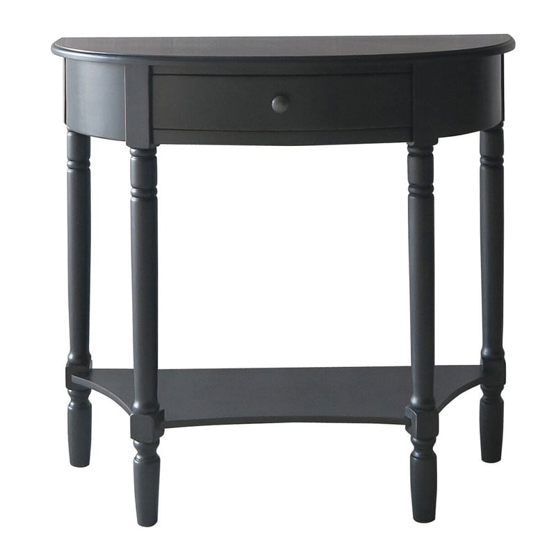 - This half moon console table is made from black finish pine wood featuring carved spindle legs, a lower open shelf and a central drawer for storage.