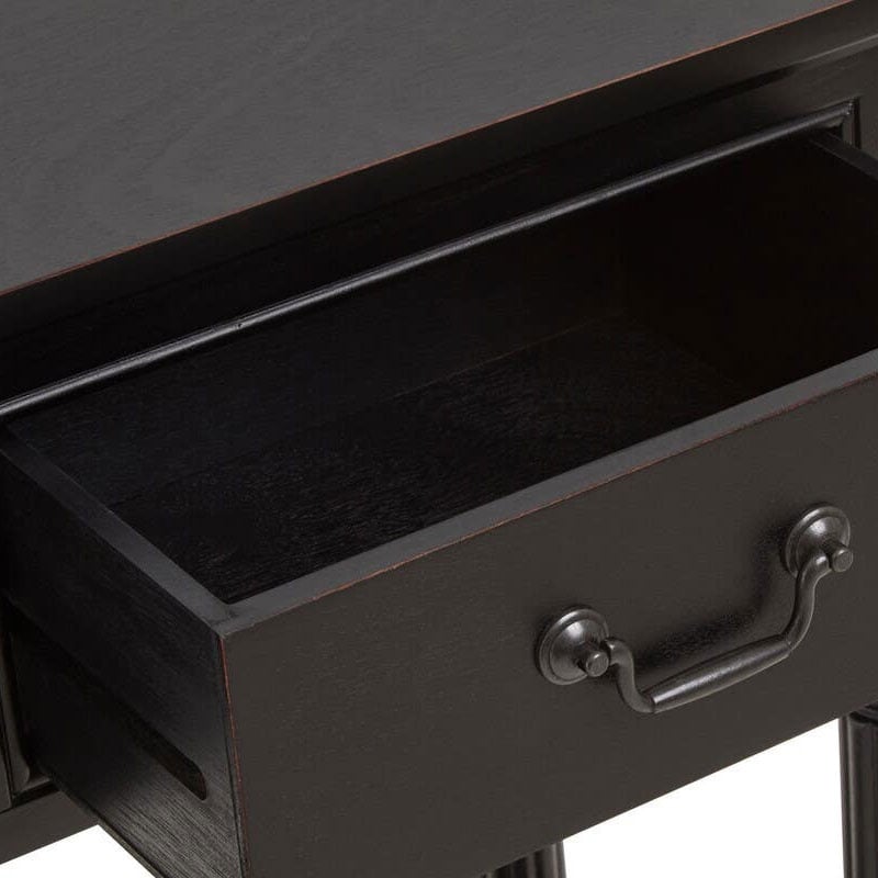 Featuring a traditional design, this pine console table in a vintage black finish exhibits charm with a touch of understated elegance. Made from pine wood, this console table features a vintage black finish and carved spindle legs, giving it a traditional look. It has three sliding drawers, each with an antique silver metallic handle complementing the black wood finish.