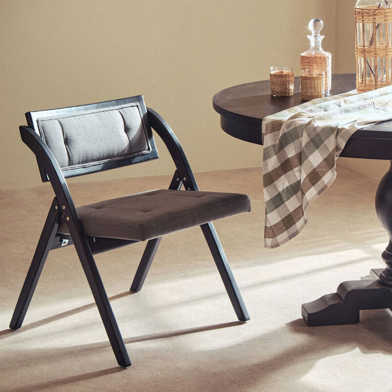 This folding chair combines modern functionality with understated elegance. It features a visually appealing frame crafted from black elm wood, with a gently curved backrest that add a subtle softness to its shape. A grey fabric seat and backrest add tactile warmth and contrast to the wood’s natural grain. Slightly angled legs contribute to stability, ensuring easy storage with a slim profile.