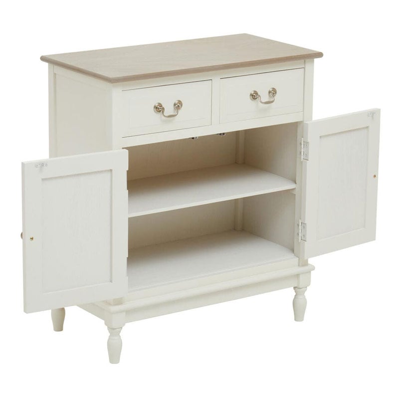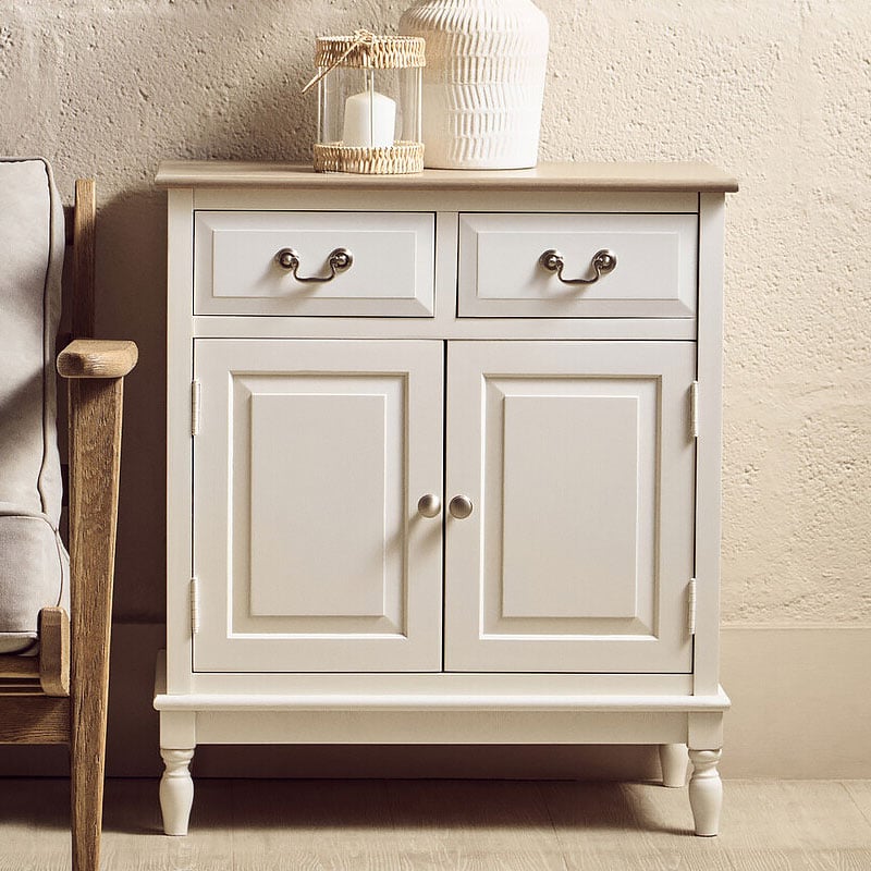 • This two-drawer and two door sideboard features a white finish, blending vintage charm with practical storage.