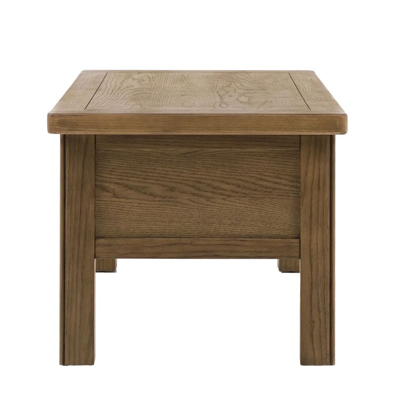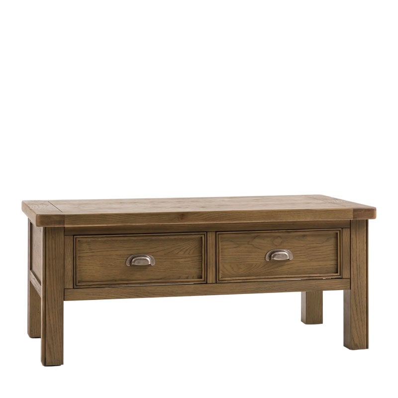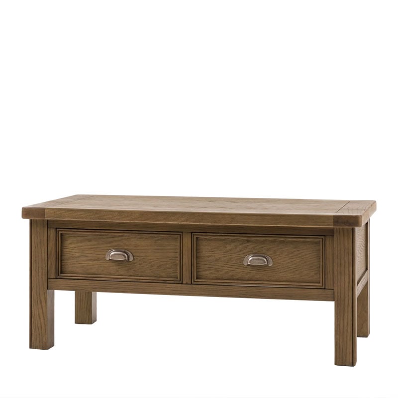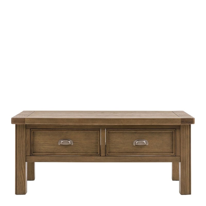 Complete your living space with this elegantly practical coffee table. Crafted from natural wood solids & veneers, this table features two spacious drawers finished off with classic metal handles, perfect for keeping essentials neatly out of sight. The finishing details, warm wood, full of rich grains and a timeless interpretation of classic design make this stunning centrepiece for any living space, full of long lasting appeal.