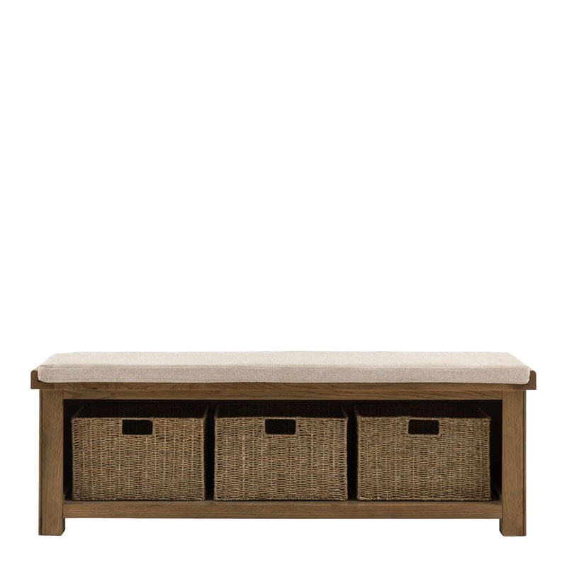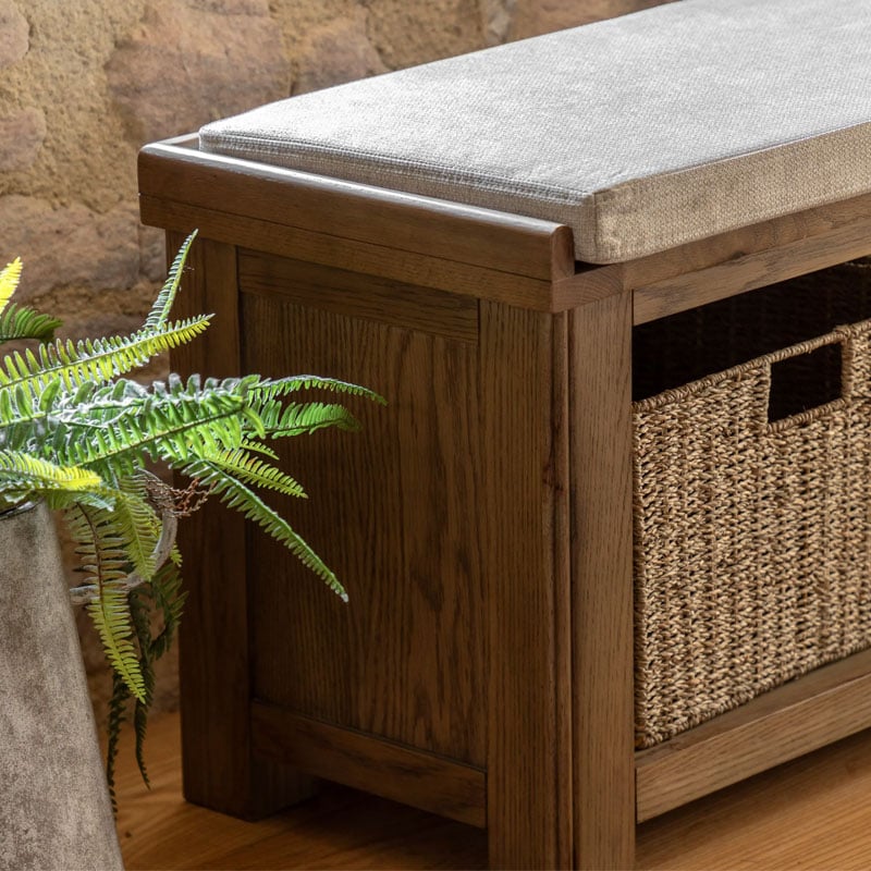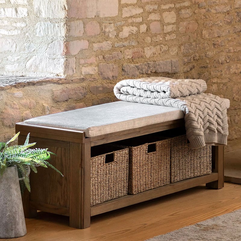 Discover the perfect blend of seating and storage with this charming hall bench. Ideal for living rooms, mudrooms or hallways, this bench offers a comfortable spot to sit and kick off your shoes, while its three natural wicker baskets keep clutter out of sight. The oak solid & veneer finish is full of rich grain detail with a warm finish, perfectly complementing the natural tone of the padded seat, creating a relaxed and inviting addition to your space.