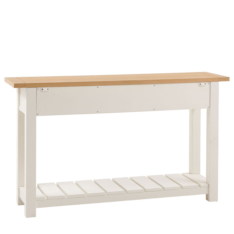 A modern update on a country classic, this console table is a versatile piece perfectly suited to both contemporary and rustic interiors. Featuring 2 drawers and a lower shelf, the console table is perfect for living rooms, dining areas and kitchens alike, offering great additional storage. The painted white finish, metal drawer pulls, and grooved & planked oak top add a modern twist to this country style console.